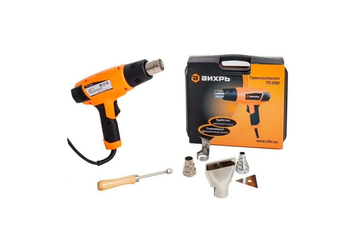 Термопистолет ВИХРЬ ТП-2000 72/2/1 используется при проведении строительно-отделочных работ для сушки и соединения твердых поверхностей. Инструмент работает от электросети (220/50). Строительный фен имеет два режима рабочей температуры: 400 и 550 С. Предусмотрено две ступени скорости воздушного потока: 300 и 500 л/мин. Рукоятка удобной формы обеспечивает удобное и надежное удержание инструмента в руке во время работы.