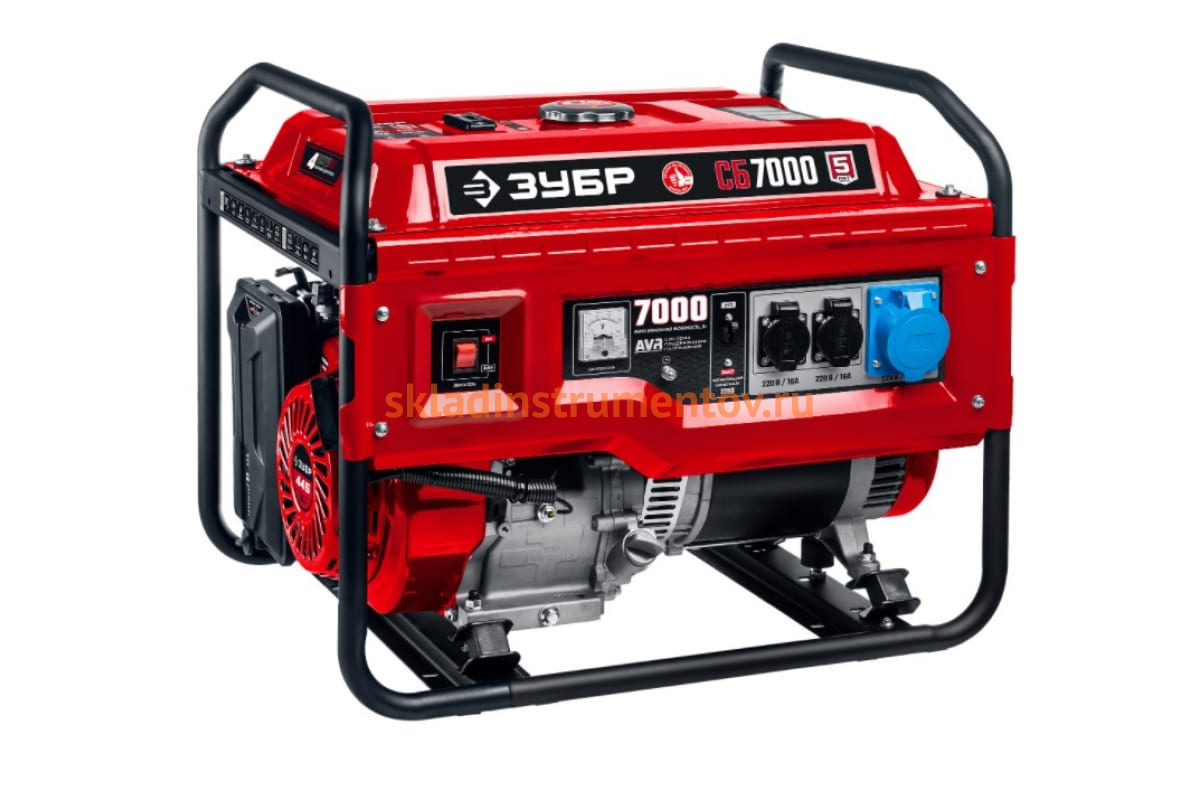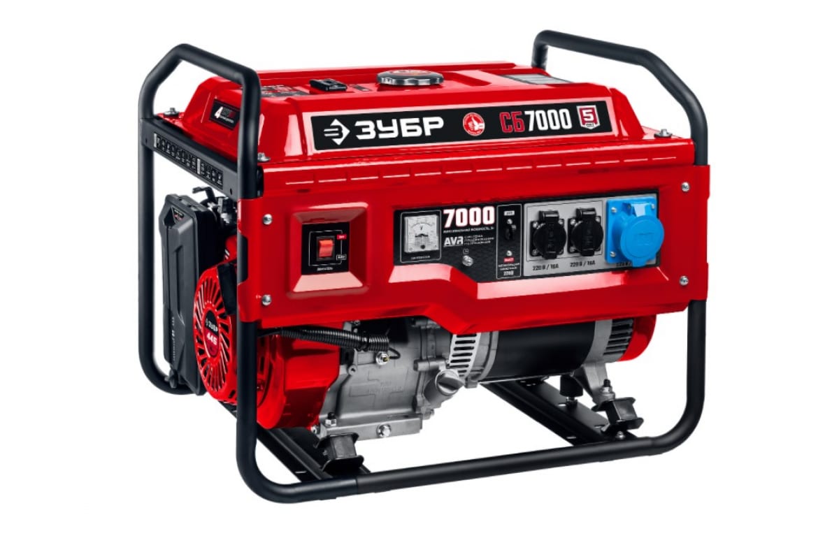 Бензиновый генератор ЗУБР 7000 Вт СБ-7000 имеет типовую компоновку с верхним расположением бензобака и прочной стальной рамой. Такая конструкция обеспечивает безопасность в использовании и упрощает обслуживание. Раму также можно использовать при транспортировке генератора.