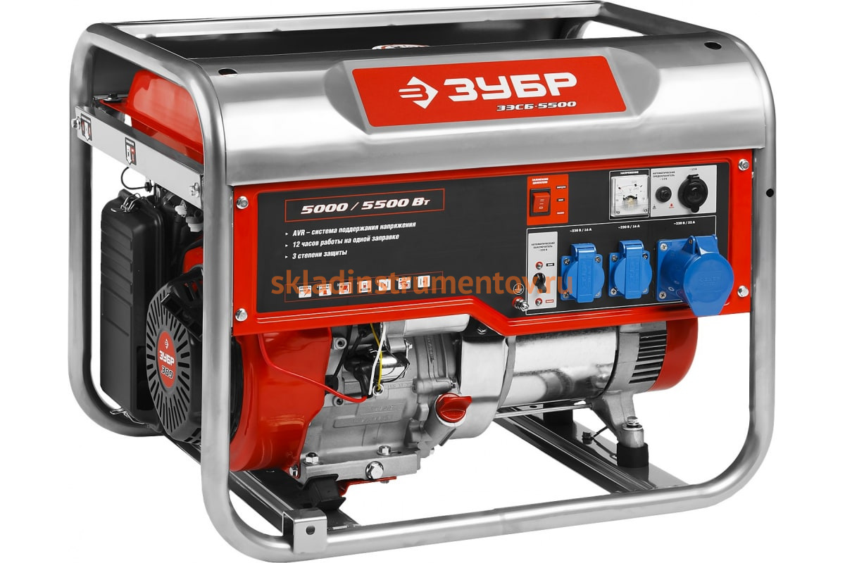 Бензиновый генератор Зубр 5500/5000Вт, 220/12В ЗЭСБ-5500 представляет собой мощную силовую технику бытового класса. Данный агрегат предназначен для эксплуатации в загородном доме, на даче, на стройке и в гараже в качестве источника резервного и аварийного питания.
