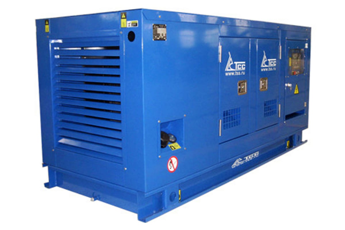 Дизельная электростанция под кожухом ТСС АД-50С-Т400-1РПМ11 113546 - стационарный агрегат, который может использоваться как аварийный или постоянный источник энергии в местах ее отсутствия. Синхронный четырех полюсной генератор, оснащенный обмоткой самовозбуждения и обратными диодами, вырабатывает ток напряжением 230 и 400 В. Жидкостная система охлаждения исключает перегрев двигателя при продолжительных нагрузках. Оборудование станции смонтировано на демпфирующих подушках, которые опираются на жесткую раму. Двигатель потребляет 12,5 литров топлива в час, а значит станция может работать на одной заправке около 11,5 часов. Металлический кожух снижает шум и защищает станцию от повреждений.