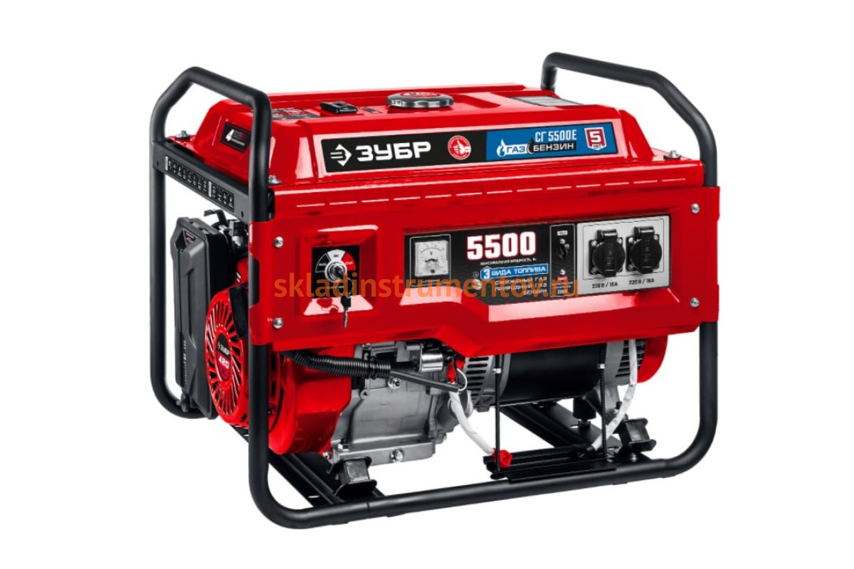 Гибридный генератор бензин/газ с электростартером ЗУБР 5500 Вт, СГ-5500Е имеет типовую компоновку с верхним расположением бензобака и прочной стальной рамой. Такая конструкция обеспечивает безопасность в использовании и упрощает обслуживание. Раму также можно использовать при транспортировке генератора.