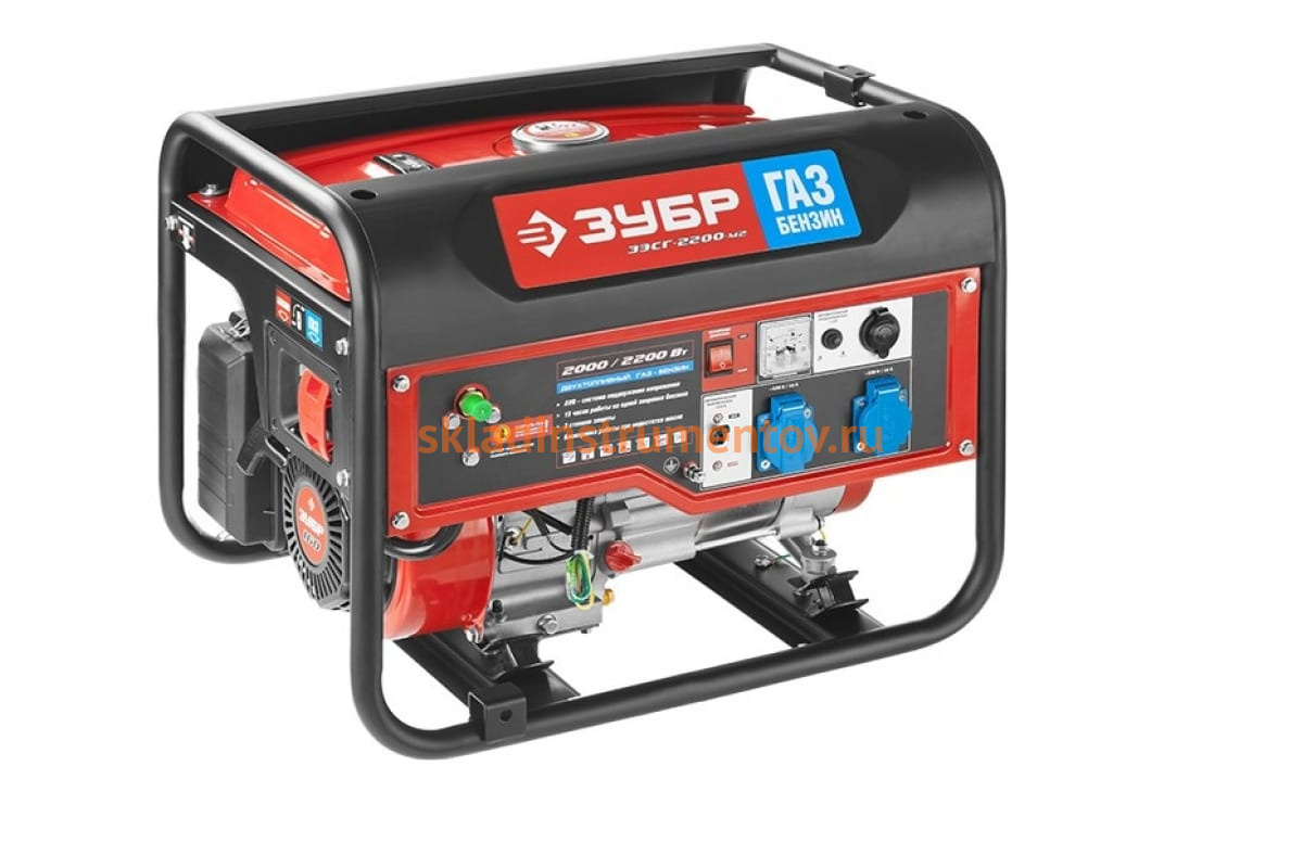Комбинированный генератор ЗУБР МАСТЕР ЗЭСГ-2200-М2 предназначен для эксплуатации как в быту, например, для питания дачи или загородного дома при отключении электричества, так и в строительстве для питания маломощного однофазного инструмента или осветительных приборов. Возможность работы на двух видах топлива поочередно существенно увеличивает время работы агрегата. Мощный двигатель Зубр отличается неприхотливым обслуживанием, надежностью и малым расходом топлива. При практически постоянной работе генератора на газу значительно увеличивается срок его эксплуатации, т.к. газ меньше, чем жидкое топливо, влияет на образование коррозии металла. Станция легко запускается при помощи ручного стартера.