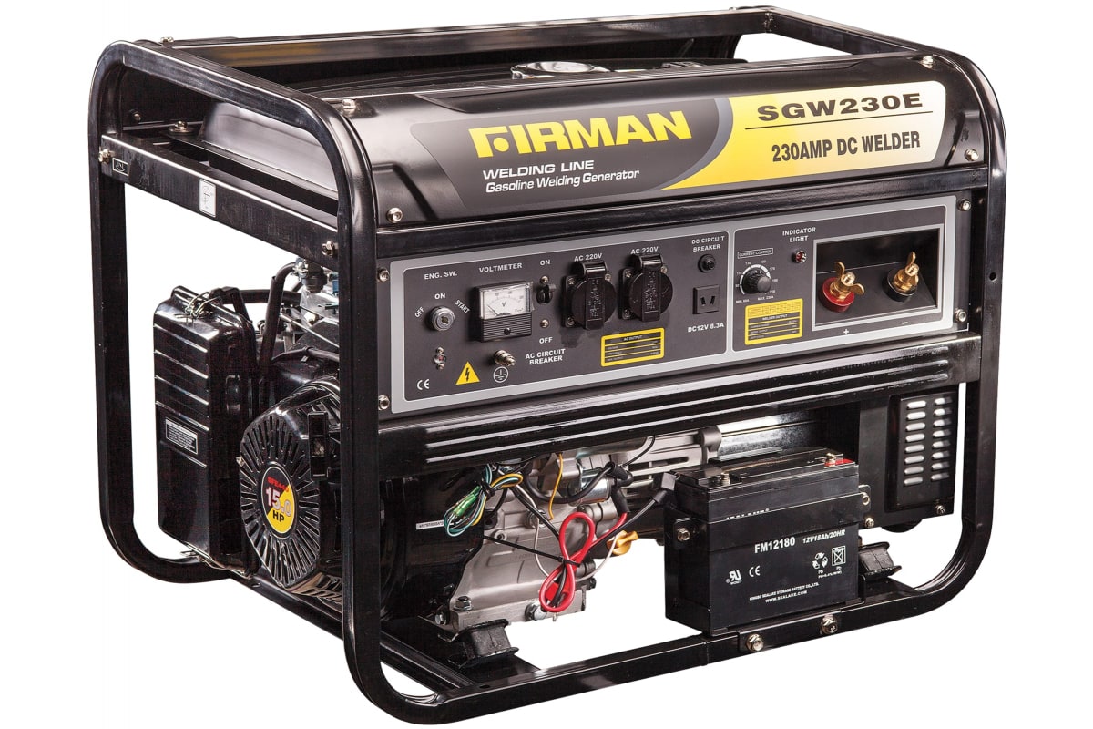 Электростанция со сварочным выпрямителем (5.0/5.5 кВт, 230В, 13 л.с., бензин, аккумулятор, сварочный ток 50-230А, электрод до 5.0 мм, передвижная) FIRMAN SGW230E используется как для подачи тока к потребителям суммарной номинальной мощностью до 5 кВт, так и для выполнения сварочных работ при помощи электродов. ПВ составляет 60% при максимальном токе. Плавная настройка силы тока упрощает подбор оптимальных значений. Для безопасного использования изделие располагается внутри прочной металлической рамы.
