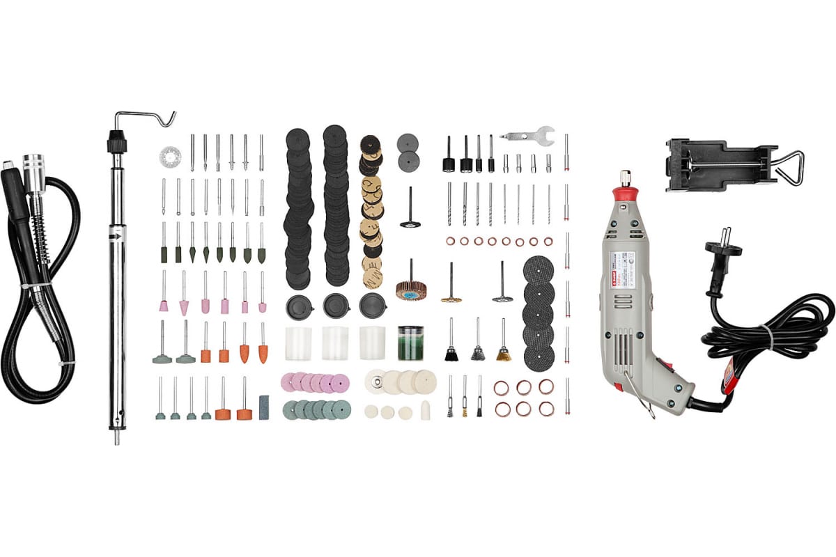 Гравер ЗУБР ЗГ-130ЭК + 242 предмета H242 - это комплект, предназначенный для выполнения широкого спектра задач: резки, шлифования, полировки, сверления, гравирования - все зависит от установленной оснастки. Модель имеет легкий доступ к щеткам, что позволяет осуществлять их замену самостоятельно. Скорость вращения шпинделя регулируется, поэтому инструментом можно одинаково продуктивно работать материалами разной плотности.