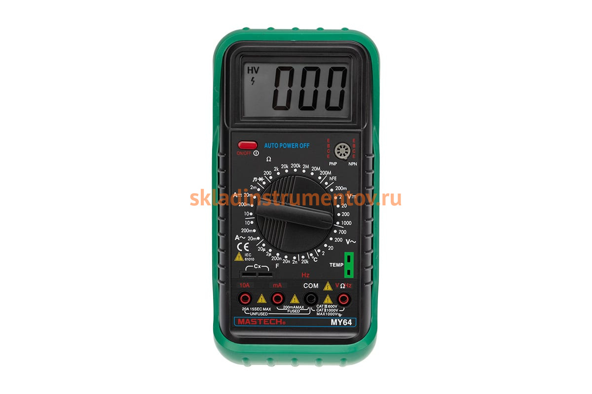 Цифровой мультиметр Mastech МY64 58957 выполняет множество функций, а именно: измерение силы тока, постоянного/переменного напряжения, сопротивления, частоты, емкости, температуры, коэффициента усиления биполярных транзисторов. Также он позволяет проверять полупроводниковые диоды и прозванивать электрические цепи. Пределы измерения величин можно выставить вручную с помощью многопозиционного переключателя. Благодаря яркому защитному кожуху из мягкого полимера, прибор защищен от повреждений при случайных падениях или ударах.