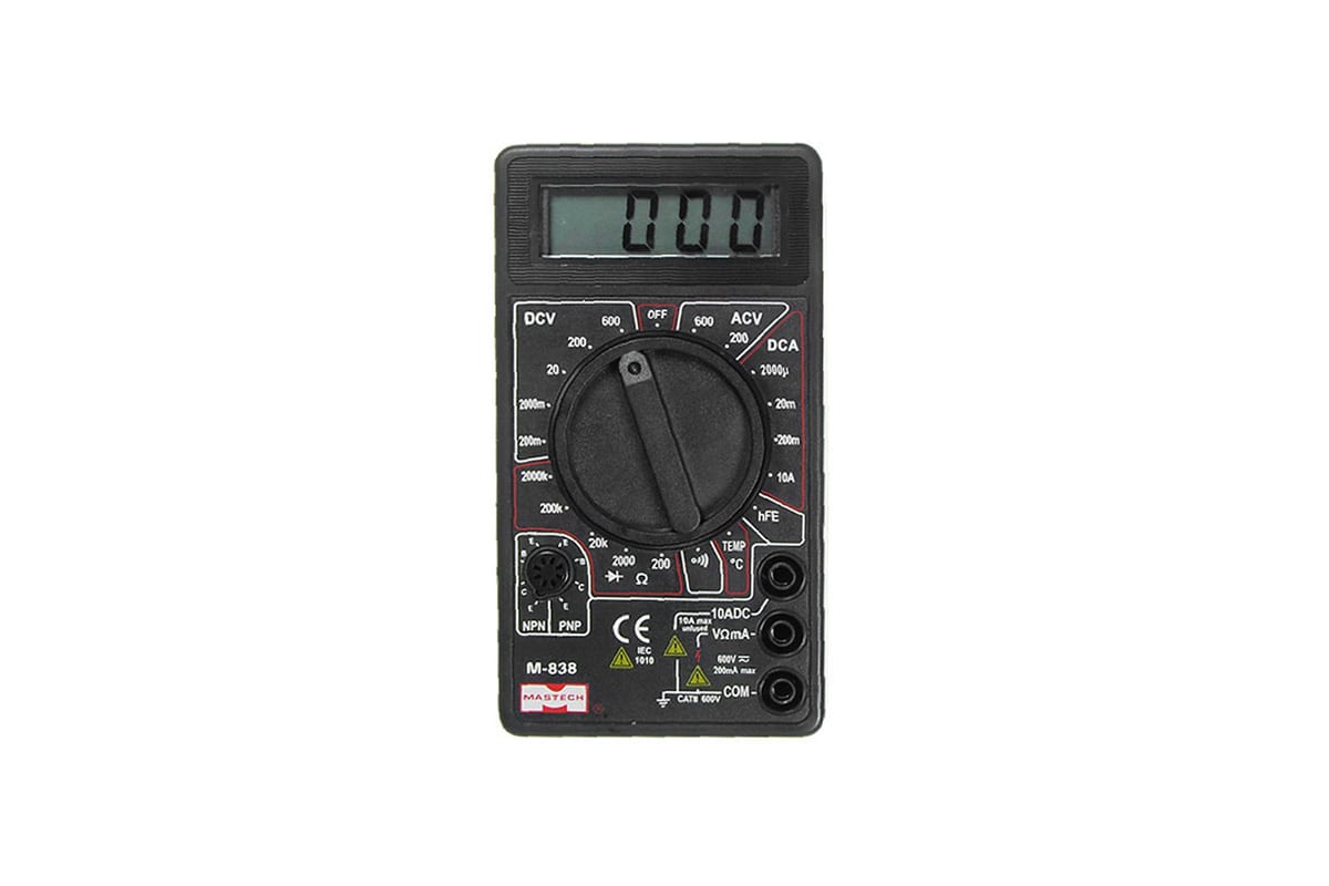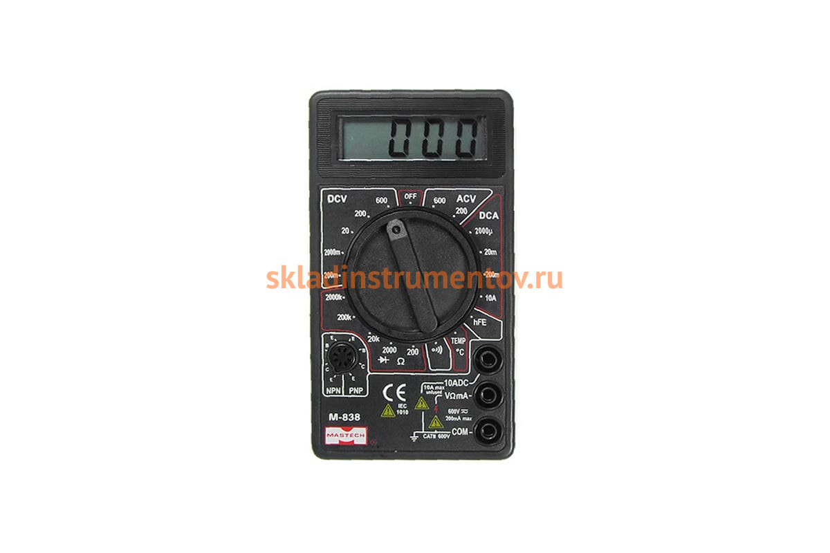 Цифровой мультиметр Mastech М 838 57599 - компактный прибор для измерения постоянного/переменного напряжения, силы тока, сопротивления, частоты, температуры, коэффициента усиления транзисторов. Он имеет режим "прозвонка" и диод-тест. Модель в секунду совершает 2 измерения. Разрядность дисплея составляет 2000 отсчетов. В комплект поставки входят измерительные щупы, 1 батарейка и термопара.