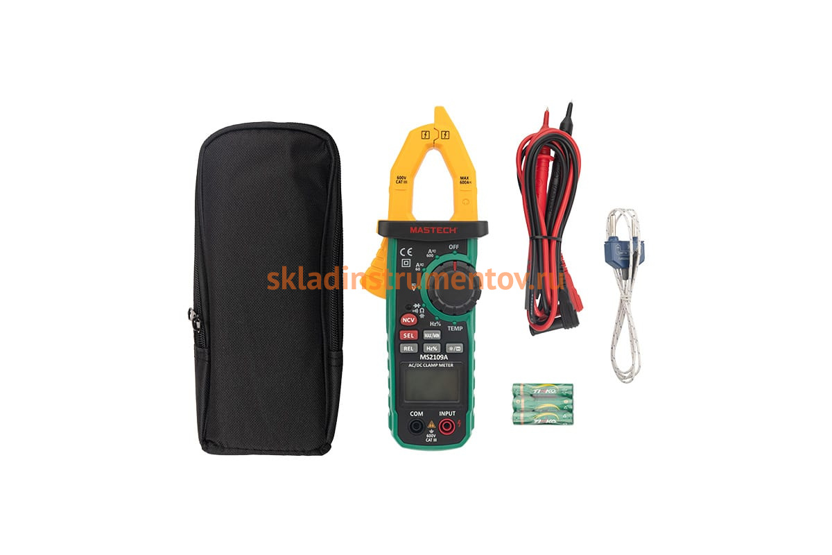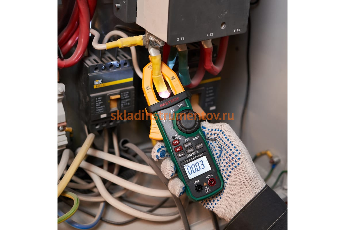 Токовые клещи MASTECH MS2109A 13-1309 - компактный и надежный прибор для измерения напряжения, силы тока, сопротивления, емкости, частоты и температуры. Максимальный диаметр захватываемого проводника составляет 25 мм.
