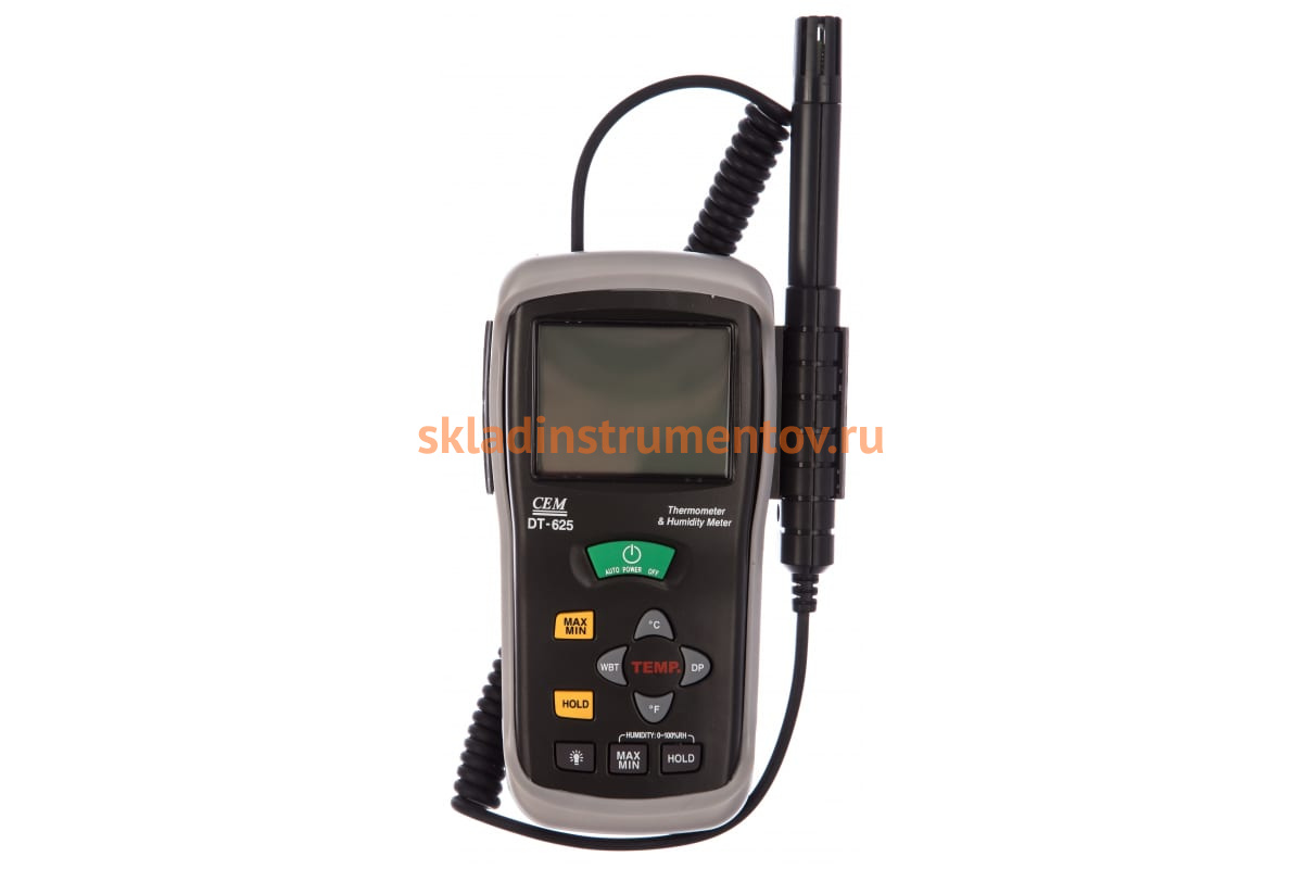 Гигрометр-термометр СЕМ DT-625 481882 оснащается двойным дисплеем для одновременного отображения температуры и влажности. Дополнительной возможностью модели является определение точки росы. Питание устройства осуществляется от современной батарейки типа Крона с напряжением 9В. Прибор весит всего 0.21 кг и имеет габариты 150х72х35 мм. Погрешность измерения влажности составляет 2%, температуры - 0.5 градуса.
