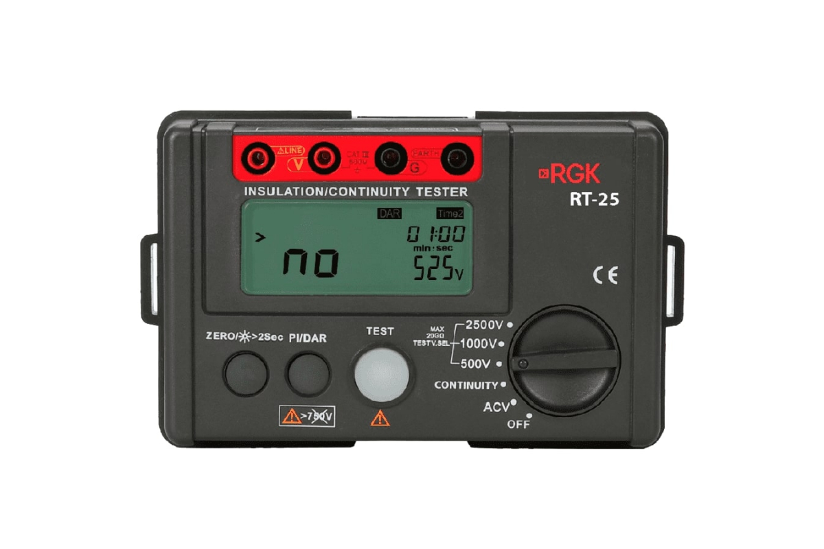 Мегаомметр RGK RT-25 776523 предназначен для оценки качества изоляции. Используется в процессе диагностики и ремонта электрооборудования, элементов энергосистем, трансформаторов, электродвигателей.