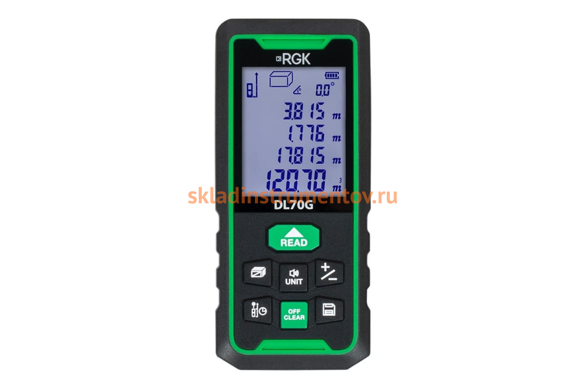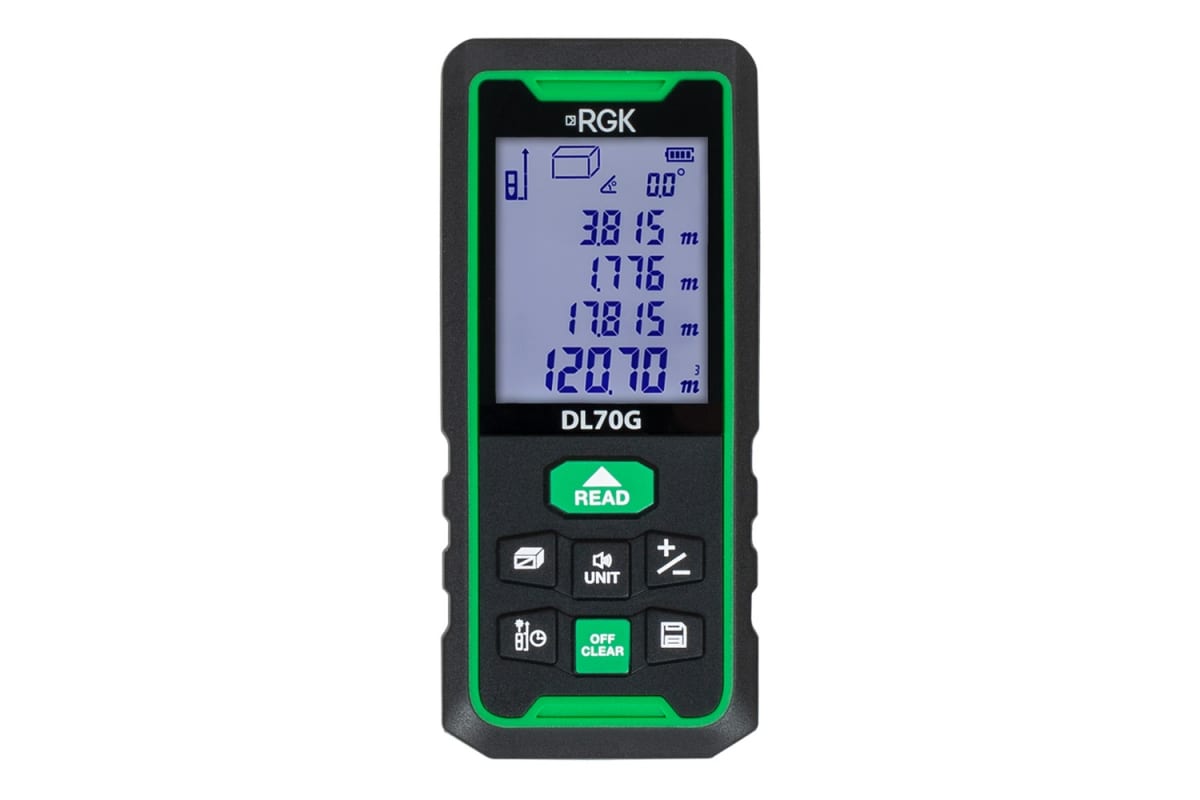 Лазерный дальномер с угломером RGK DL70G 778183 предназначен для измерения расстояния до 70 метров.