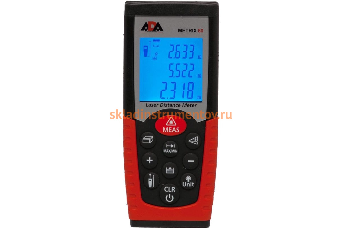 Лазерный дальномер ADA Metrix 60 А00105 сконструирован для работ на строительных объектах и в быту. Область применения - измерение расстояний до выбранных предметов. Благодаря возможности включения подсветки экрана, работать устройством удобно при пасмурной погоде, в вечернее и ночное время на улице и в темных помещениях.