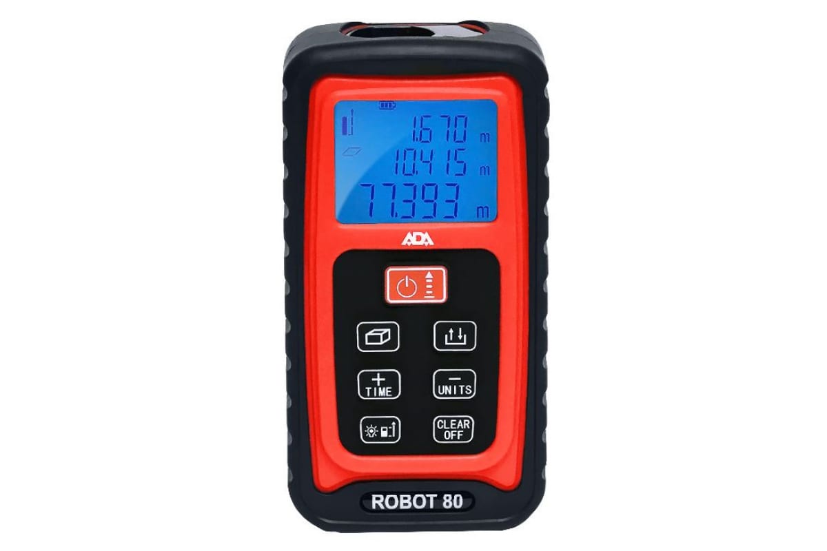 Лазерный дальномер ADA Robot 80 А00288 предназначен для измерения расстояния до 80 метров. Возможна работа как внутри, так и снаружи помещений. Модель оснащена многопозиционной скобой для совершения удобных замеров из углов, щелей и прочих узких мест. Для возможности расчета недоступных отрезков, вычисления площади и объема, а также сложения и вычитания имеется функция Пифагора. Из дополнительных функций следует отметить наличие режима непрерывного измерения, измерения максимальных и минимальных расстояний, сложения различных площадей с одним общим параметром (например стен в одном помещении). В памяти инструмента сохраняется до 20 результатов измерений.