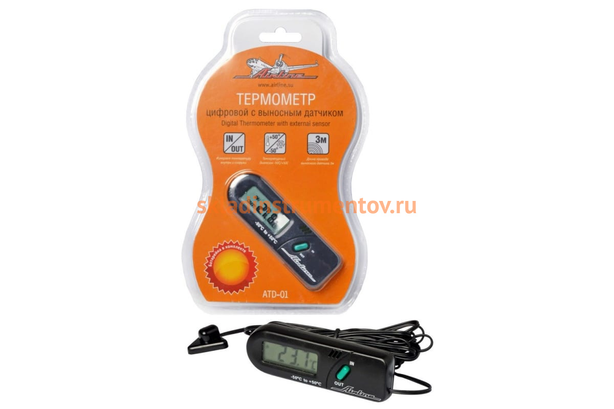 Цифровой термометр с выносным датчиком Airline ATD-01 измеряет температуру воздуха.