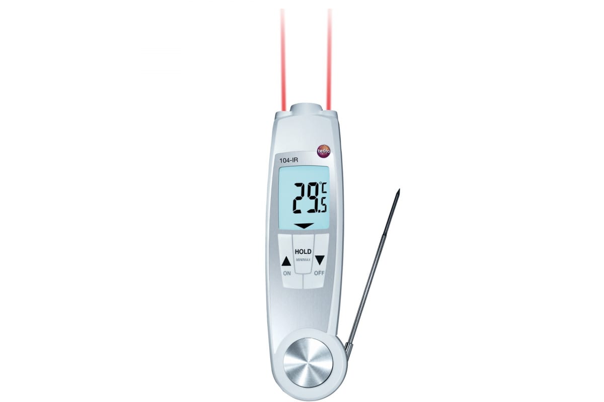 Инфракрасный термометр Testo 104-IR с поверкой подходит для использования во всех областях пищевого сектора. Его основное назначение - проникающее и инфракрасное измерение температуры. С помощью прибора можно определить температуру как отдельных продуктов, так и упаковок бесконтактным способом. Проверить внутреннюю температуру позволяет проникающий зонд. Все результаты выводятся на крупный дисплей с подсветкой. Прибор имеет компактные размеры и надежно защищен от влаги (класс защиты - IP65).