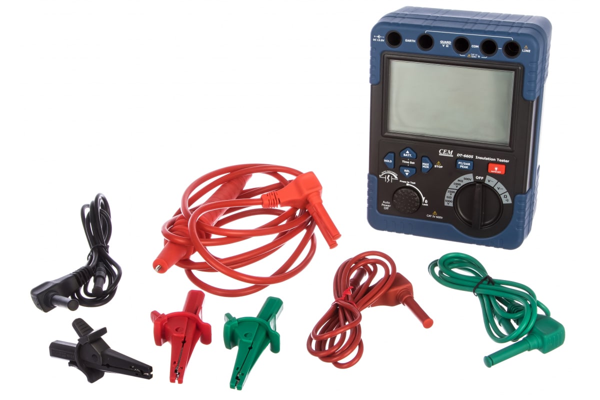 Мегаомметр СЕМ DT-6605 481653 представляет собой портативный прибор для измерения сопротивления изоляции высоковольтных линий. 4 диапазона напряжения (500В, 1000В, 2500В, 5000В) позволяют настраивать микрокомпьютер на работу с конкретным объектом. В режиме прозвонки цепи предусматривается наличие звукового сигнала. Для комфорта в работе есть возможность выбирать уровень подсветки экрана.