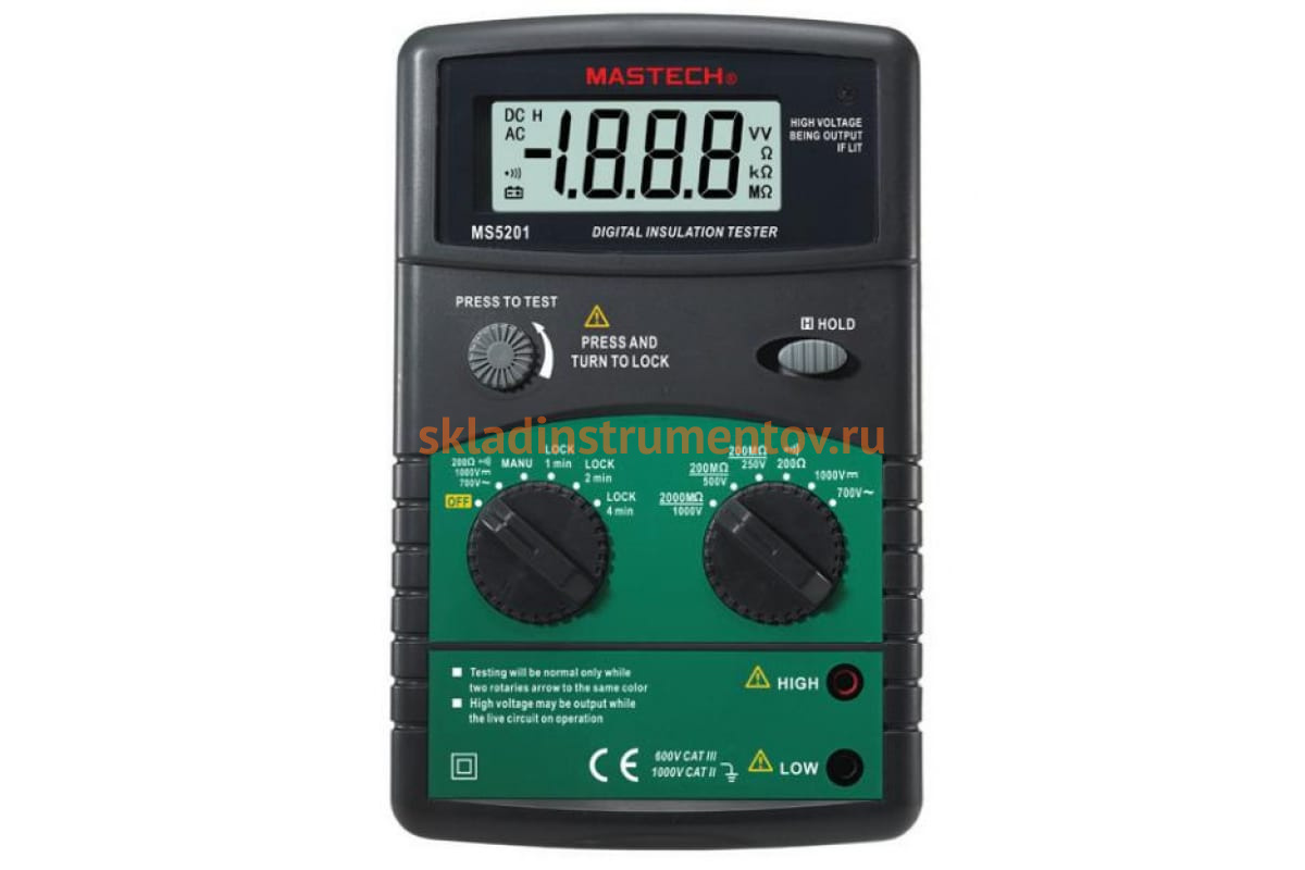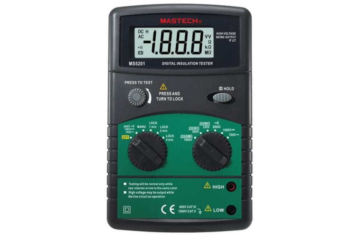 Цифровой мегаомметр Mastech MS5201 59271 помогает измерять сопротивление, постоянное/переменное напряжение и ток короткого замыкания. Благодаря функции DATA HOLD можно удерживать только что полученные данные на дисплее. Имеется режим "прозвонка". Модель питается от 6 батареек 1.5 В типа АА. Прибор поставляется в пластиковом кейсе, в котором его удобно хранить и транспортировать.
