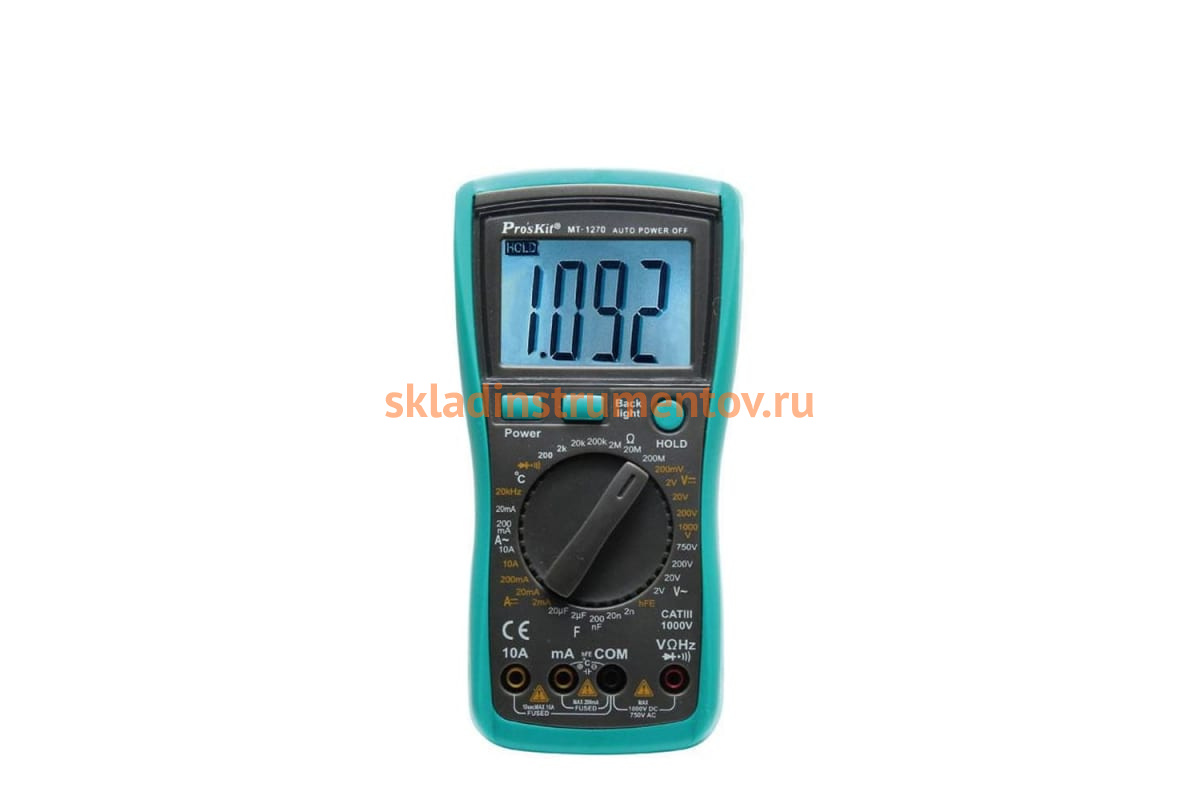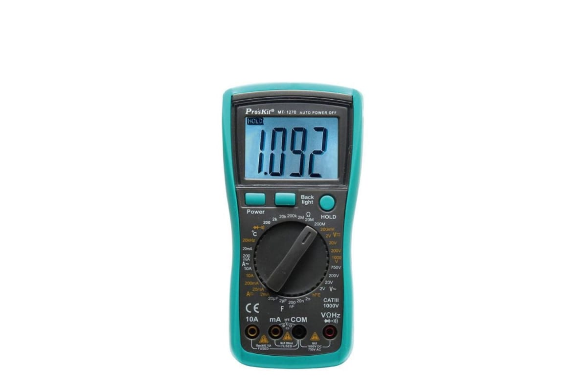Мультиметр ProsKit MT-1270 00285288 служит для измерения силы тока и переменного напряжения, сопротивления, частоты, емкости и температуры. Поддерживает функции прозвонки цепи и тестирования диодов.