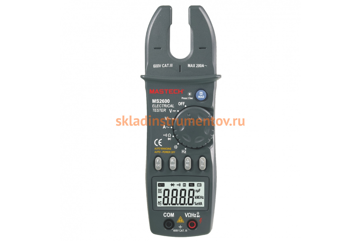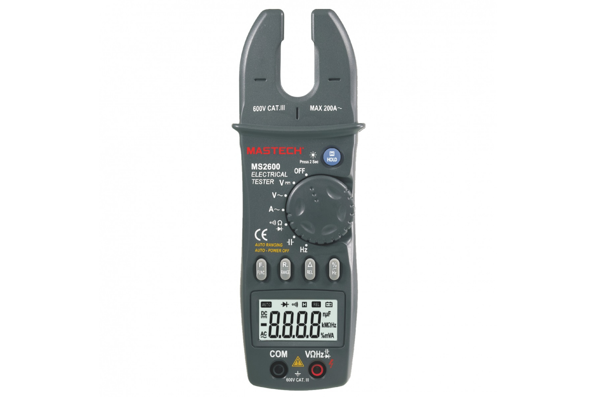Токоизмерительные цифровые автоматические клещи Mastech MS2600 ACA 00-00000284 измеряют силу тока, величину напряжения постоянного и переменного тока, сопротивления, емкости, частоту и скважность импульсов.