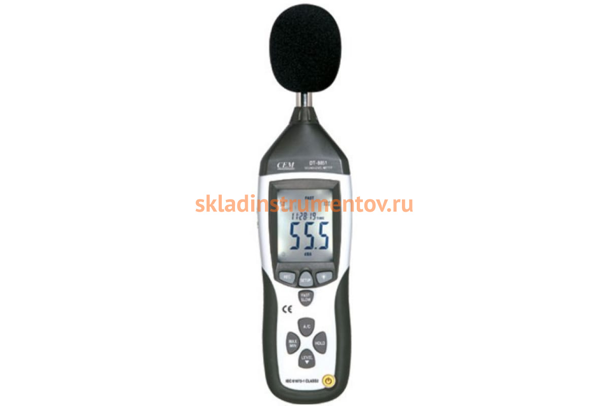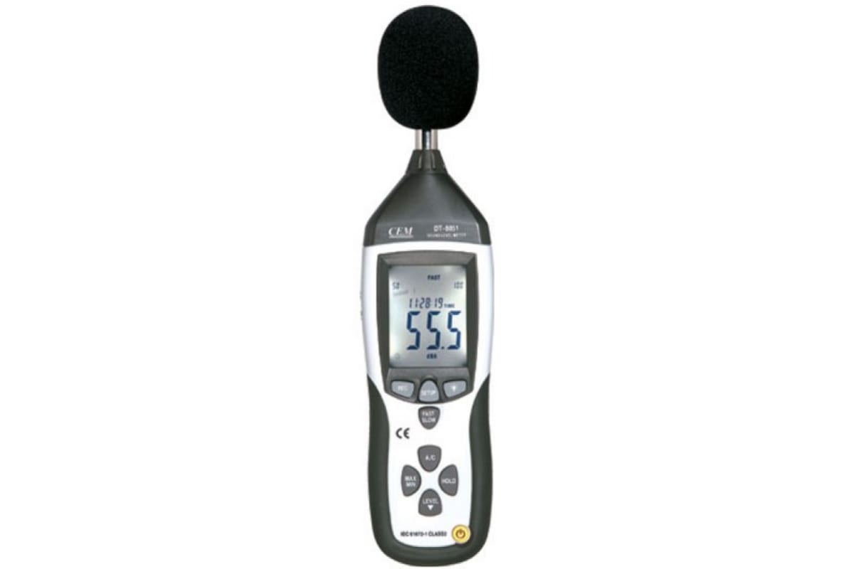 Цифровой шумомер СЕМ DT-8851 480748 улавливает изменение звука на 0.1 дБ. Есть возможность подключать прибор к компьютеру через USB-порт. В зависимости от выбранного режима время измерения составляет 125 мс или 1 с. Модель соответствует таким современным стандартам, как IEC61672-1 (class 2) и ANSI S1.4 (тип 2). Для удобства в работе предусматривается подсветка жидкокристаллического дисплея.