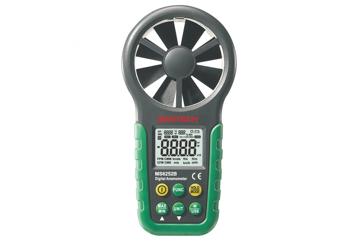 Анемометр с крыльчаткой Mastech MS6252B 00-00000226 разработан для измерения скорости ветра и объема воздуха, температуры окружающей среды, влажности, температуры точки росы. Отображает минимальные и максимальные значения.