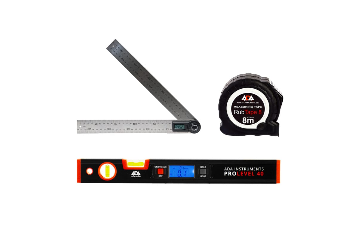 Комплект ADAА00620 включает в себя цифровой уровень ProLevel 40, рулетка RubTape 8 и угломер AngleRuler 30.