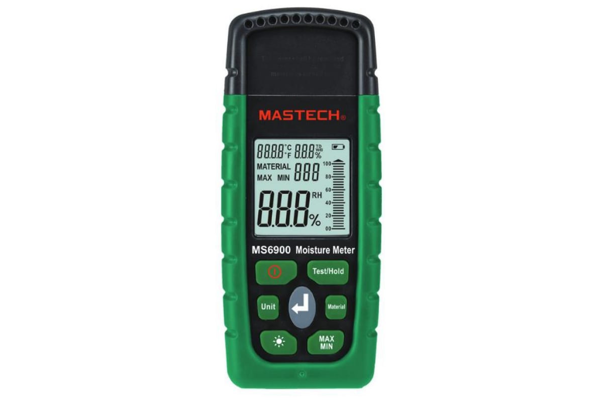 Цифровой влагомер Mastech MS6900 65303 позволяет измерять содержание влаги в древесине, стройматериалах, хлопке, бумаге, табаке и т.д. Также с помощью него можно определять температуру и влажность воздуха, отслеживать максимальные и минимальные показания влаги. Малые вес и габариты прибора способствуют комфортной работе пользователя. Он работает от 2 батареек 1,5 В ААА. Модель поставляется в сумке, в которой её удобно хранить и транспортировать.