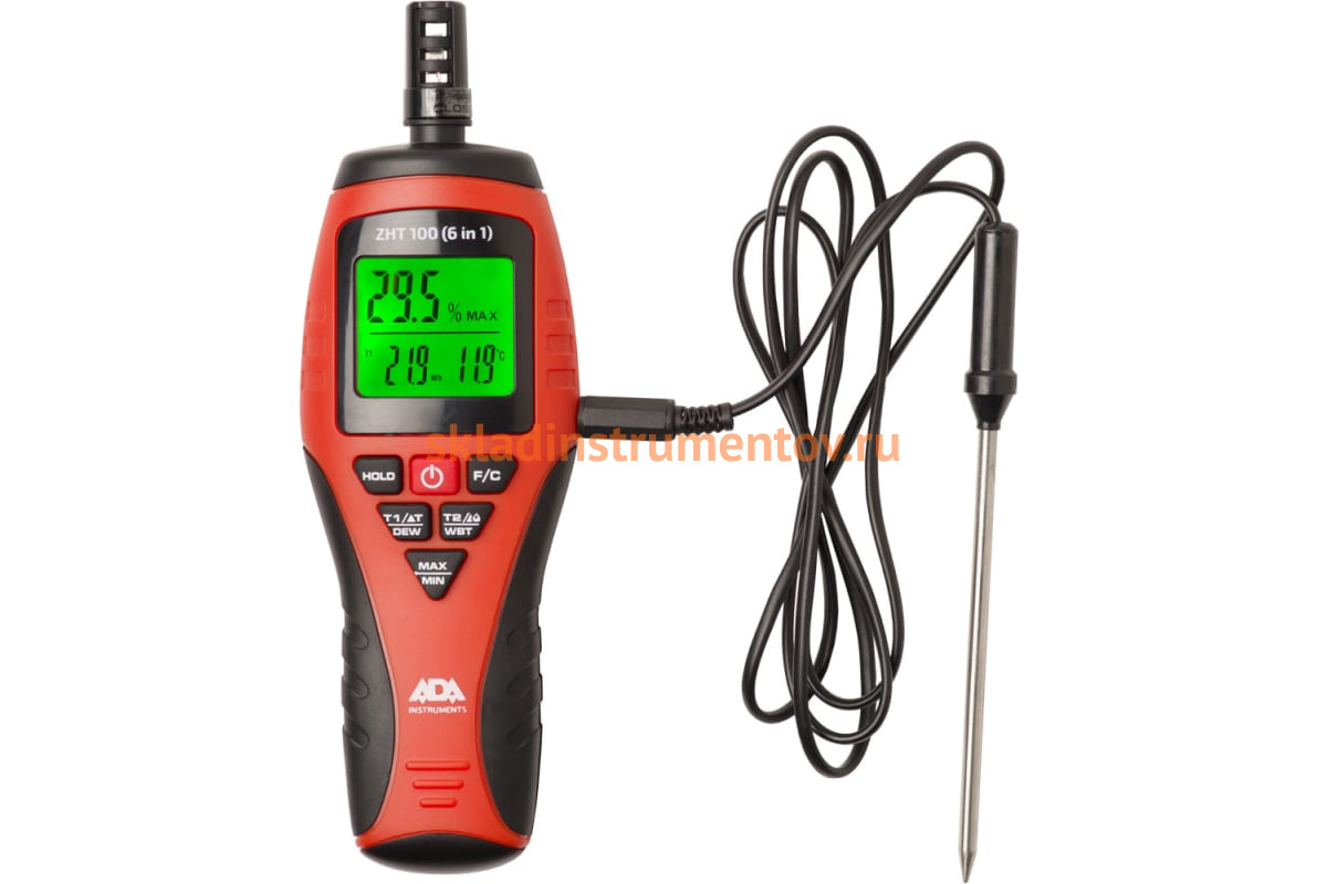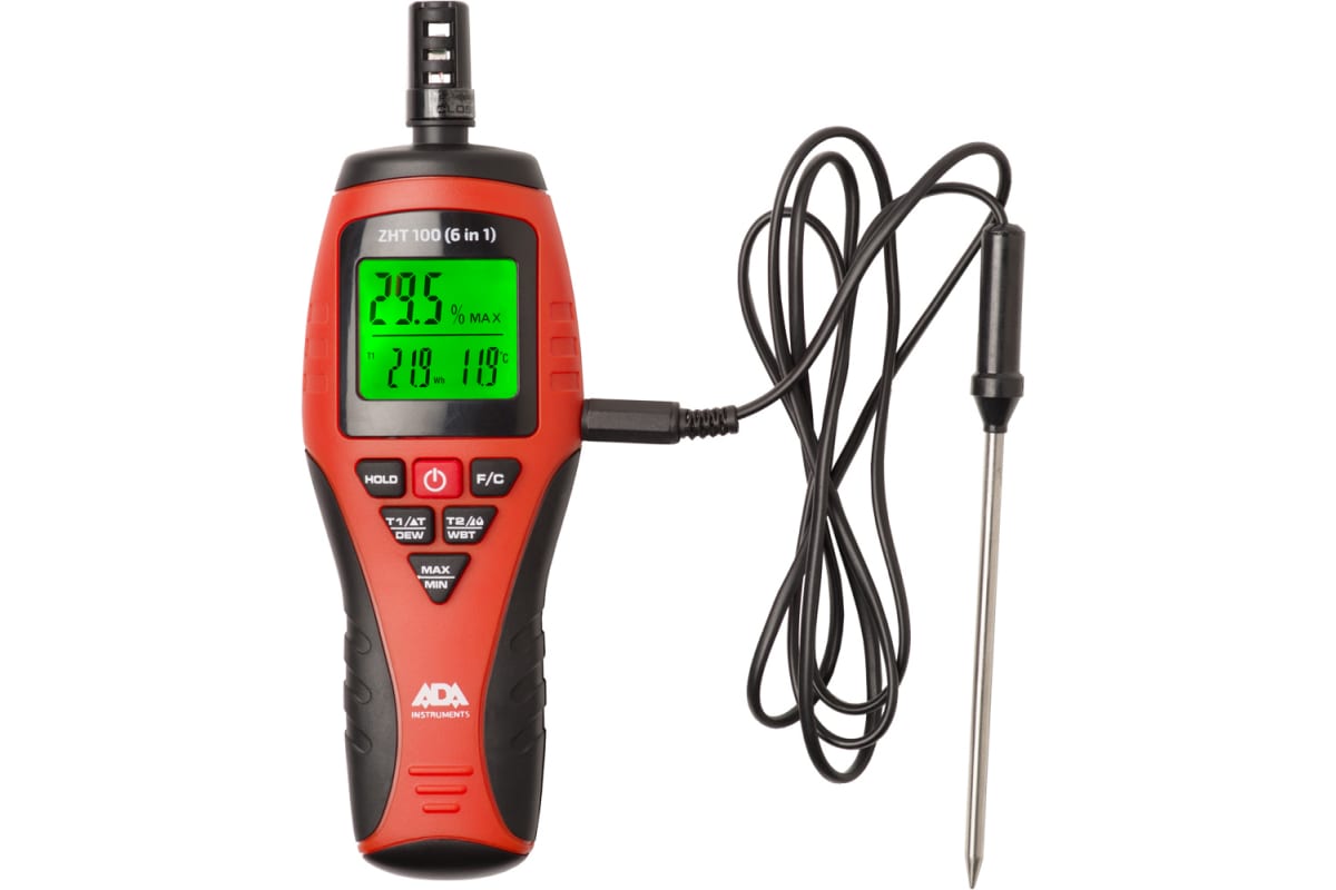 Бесконтактный измеритель влажности и температуры ADA ZHT 100 6в1 с калибровкой А00400К применяется для измерения параметров окружающей среды в сельском хозяйстве, лесной промышленности и скотоводстве. Все необходимые данные отображаются на ЖК-дисплее с подсветкой, облегчающей считывание показаний в слабоосвещенных местах. При бездействии более 10 секунд автоматически отключается подсветка, а через 20 минут - сам прибор, что позволяет экономить заряд элемента питания. Модель работает от 1 батарейки типа "Крона" напряжением 9 В.