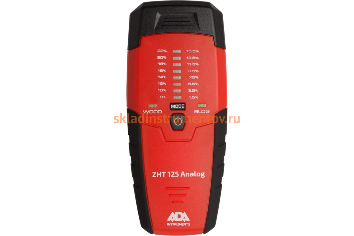 Контактный измеритель влажности древесины и стройматериалов ADA ZHT 125 Analog А00399 широко используется в строительстве, на складах пиломатериалов, сушильных установках древесины. Он прост в управлении. С помощью специальной кнопки можно выбрать тип материала. Светодиодные индикаторы показывают содержание влаги. При бездействии устройство автоматически отключается через 3 минуты.