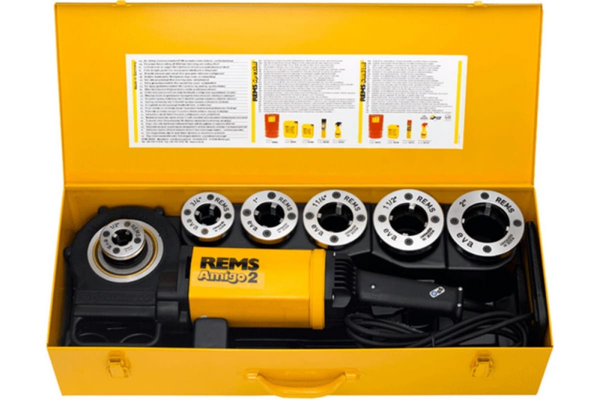 Электроклупп, 220В, с держателем, в стальном ящике, головки R 1/2-3/4-1-1.1/4-1.1/2 -2" REMS Амиго 2 540020 представляет собой простой и удобный в работе высокопроизводительный электрический клупп для нарезания резьбы. Он отличается высокой надежностью и превосходным качеством исполнения. Обеспечивает точную обработку, легкий надрез трубы и нанесение резьбы. Гребенки не дерут, удлиненная точная направляющая обеспечивает отличное центрирование трубы. Наличие отверстий в головке обеспечивает хороший отвод стружки.