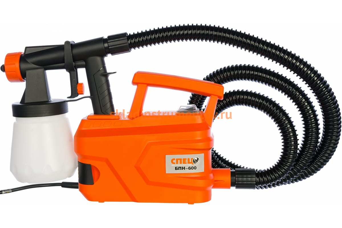 Электрический краскопульт СПЕЦ БПН-600 СПЕЦ-3264 уверенно работает с жидкостями вязкостью до 80 дин/сек. Интенсивность потока распыляемой краски настраивается при помощи специального регулятора. На корпусе есть удобная ручка для переноски модели по рабочей площадке. Приспособление оснащается современным турбонагнетателем, который существенно облегчает подачу краски к обрабатываемому объекту.