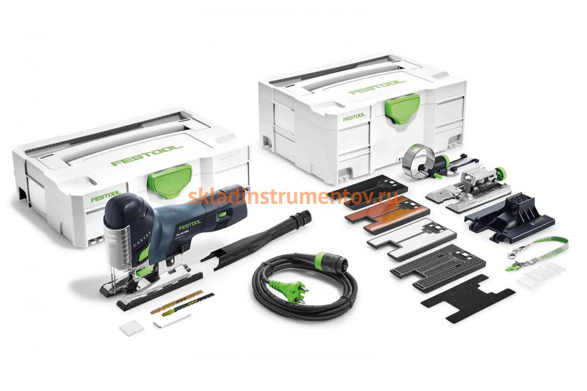 Лобзик FESTOOL CARVEX PS 420 EBQ-Set 576620 используется для криволинейных пропилов, поперечной распиловки, выпиливания углублений в балках, пропила снизу, выпиливания пазов в соединительных планках.