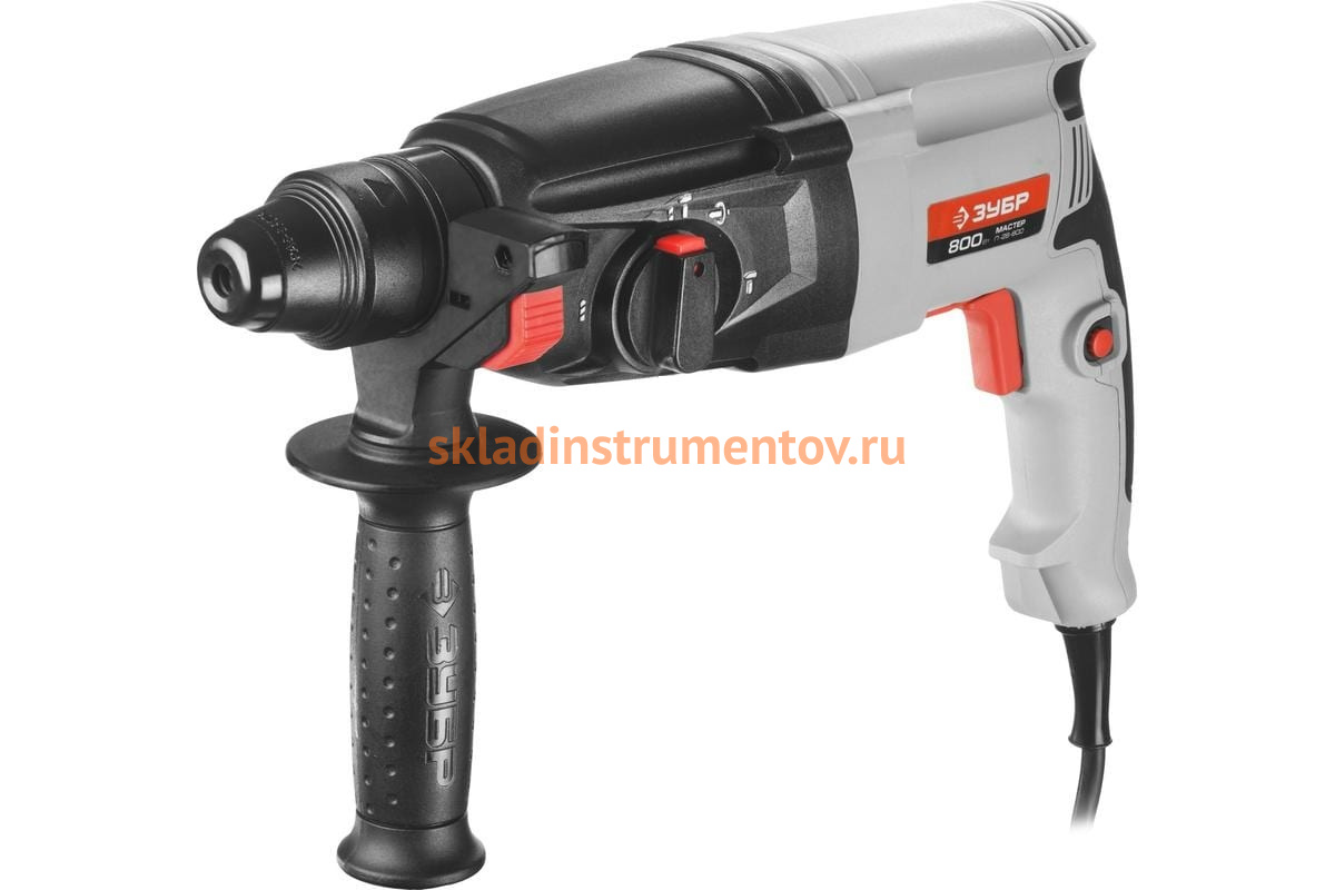Перфоратор ЗУБР МАСТЕР П-26-800 имеет три режима работы: сверление, сверление с ударом и долбление. Также предусмотрен режим поворота долота - на определённый градус после каждого удара. Переключение между ними осуществляется с помощью тумблера сбоку на корпусе. Для удобства продолжительной по времени работы имеется фиксатор клавиши "Пуск", что исключает необходимость постоянно держать на ней палец.