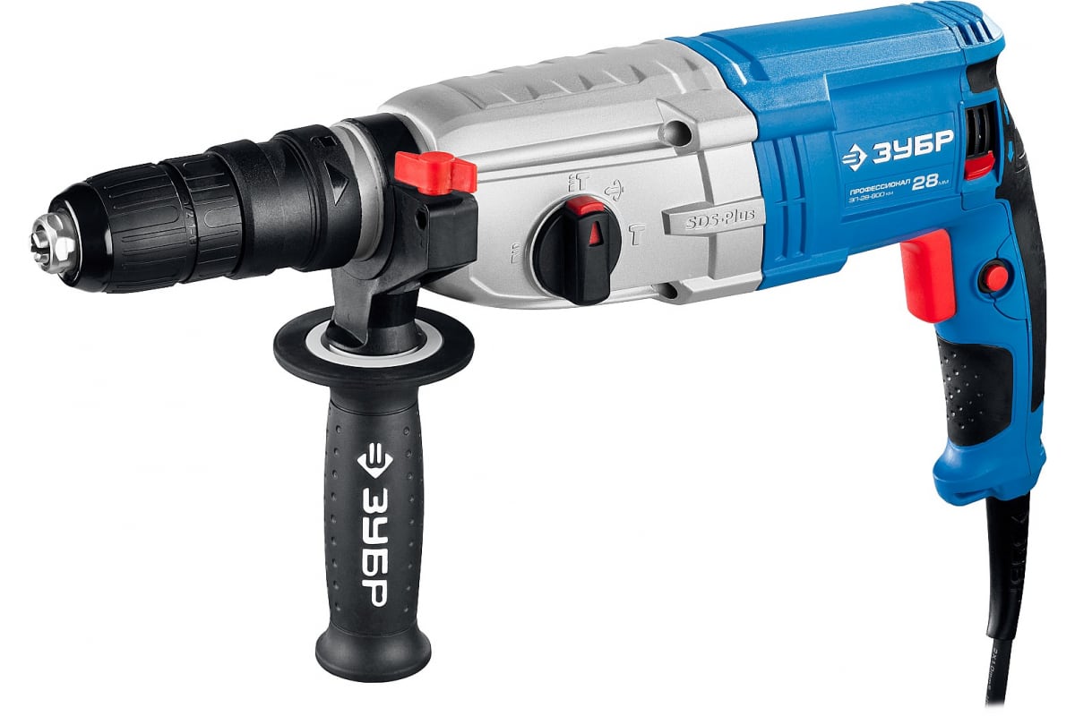 Перфоратор ЗУБР ЗП-28-800 КМ имеет три режима работы: сверление, сверление с ударом и долбление. Также есть режим поворота долота. Инструмент оснащен функцией реверса - для легкого выкручивания сверла из материала. Поворотный щеткодержатель увеличивает рабочий ресурс угольных щеток и обеспечивает равную мощность в обоих направлениях вращения. Основная рукоятка снабжена резиновыми вставками, что способствует надежному удержанию инструмента.
