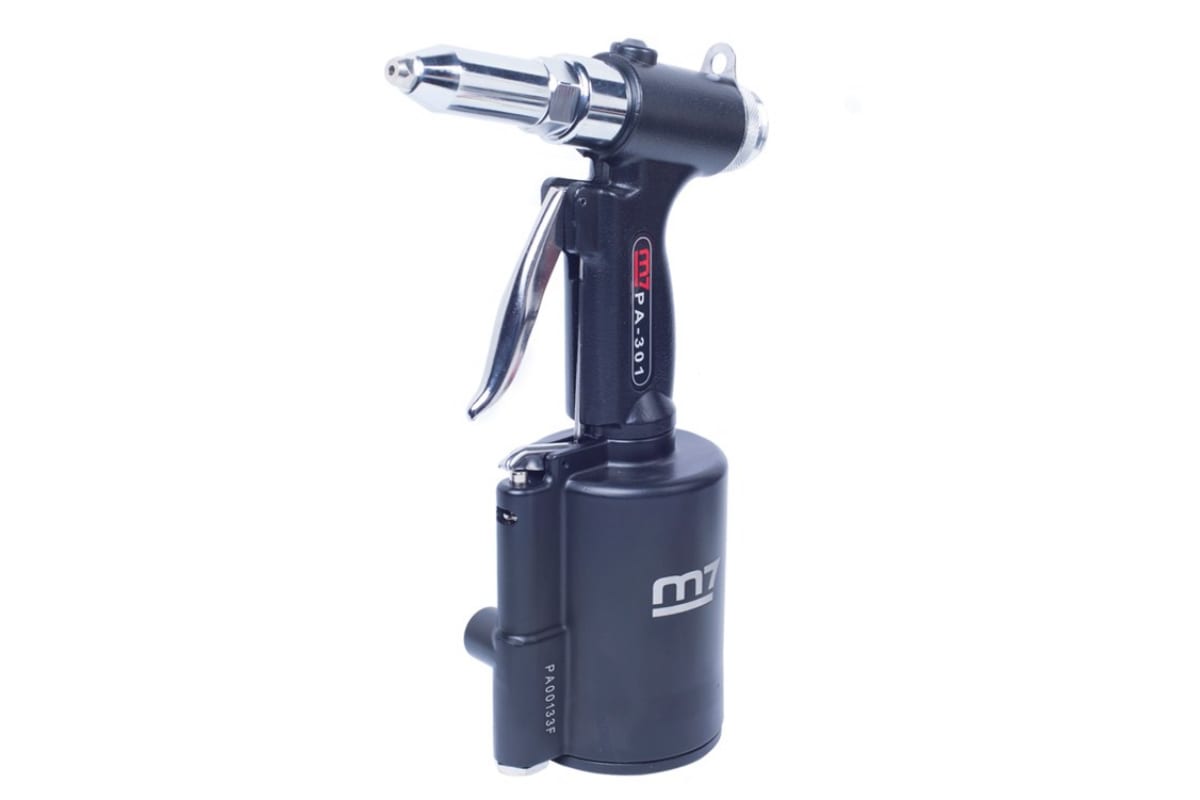 Пневмогидравлический заклепочник MIGHTY SEVEN PA-301 - современное устройство для соединения различных деталей с помощью заклепок. Приспособление широко используется в авиационной, автомобильной, а также судостроительной промышленности. Агрегат работает на сжатом воздухе, что обеспечивает высокую производительность работы при минимуме усилий. Для подключения заклепочника к компрессору рекомендуется использовать шланг с внутренним диаметром 10 мм.