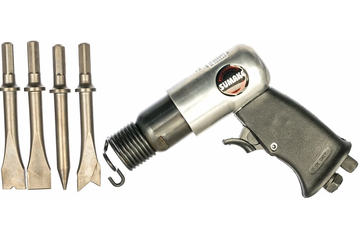 Пневмомолоток SUMAKE + 4 зубила ST-2310/H 7359 используется как для отбойных, так и зачистных работ. Металлический корпус гарантирует долгий срок службы. Рукоять с нескользящим покрытием для комфортного удержания инструмента при работе. Пневмодвигатель устойчив к перегрузкам. В комплект поставки входят 4 зубила, что позволяет приступать к работе сразу после покупки.