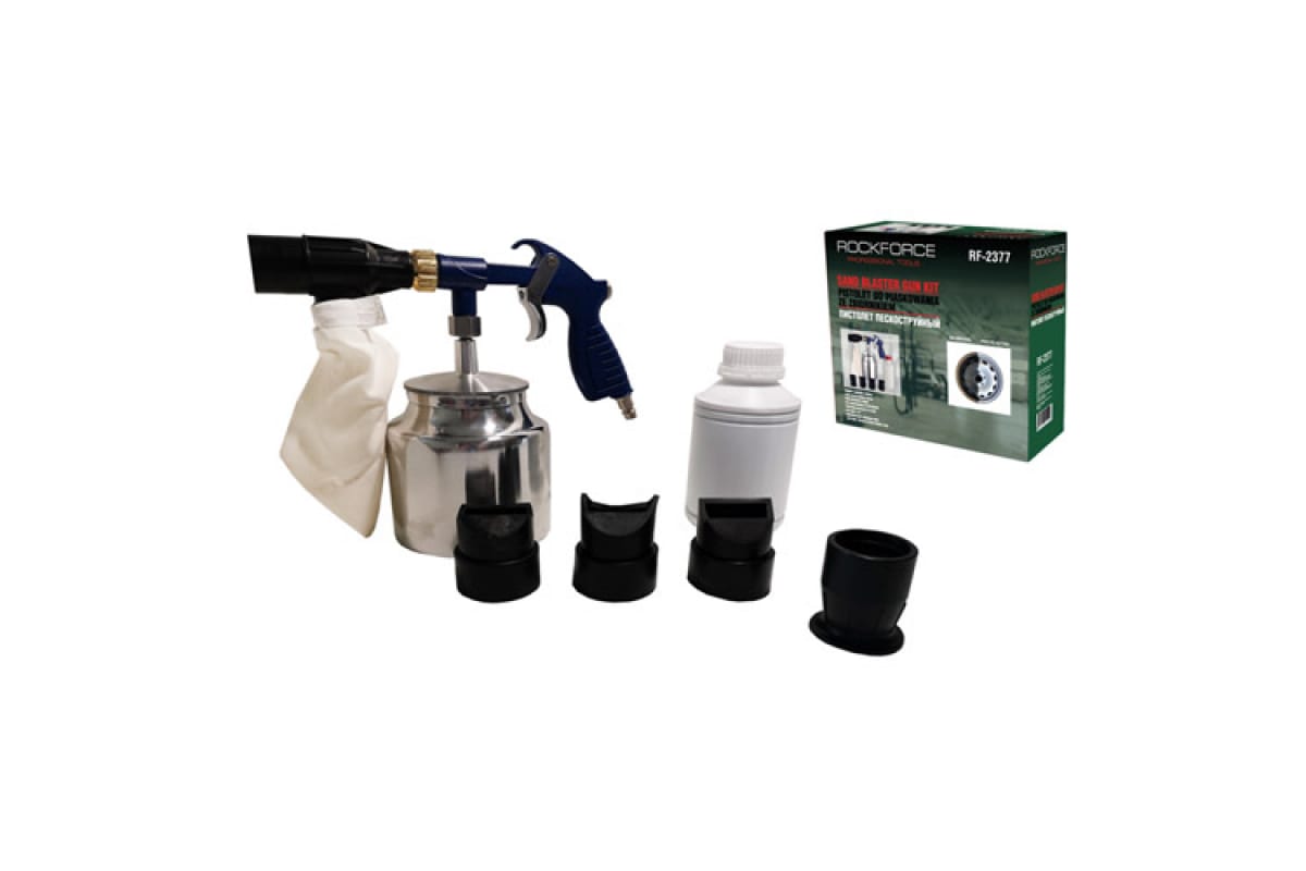 Пескоструйный пневматический пистолет со сменными насадками и песком ROCKFORCE RF-2377 обеспечивает качественную очистку поверхностей.