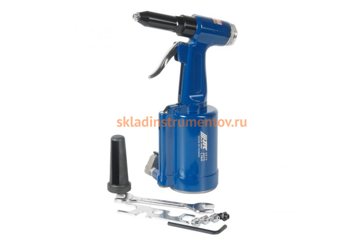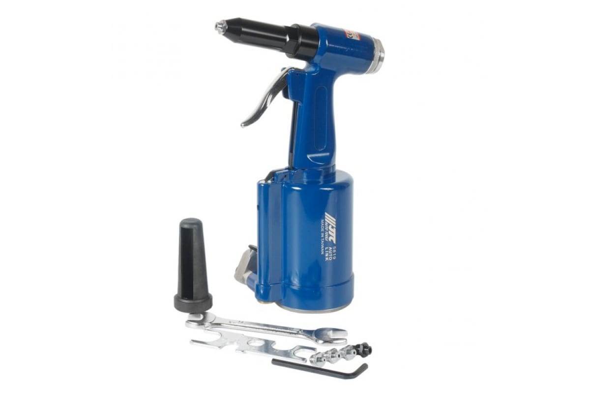 Пневматический заклепочник JTC 5819 предназначен для профессионального использования в мастерских по ремонту автомобилей или на строительных площадках. Благодаря небольшому весу и "пистолетной" форме корпуса инструмент удобно держать в руке, хранить, а также переносить от одной рабочей точки к другой. Используется для соединения различных, преимущественно, металлических деталей и изделий алюминиевыми клепками. Расход воздуха - 5 л/заклепка.