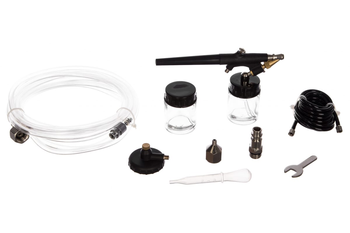 Аэрограф ABAC + набор 750119 используется для окраски поверхностей. Сопло диаметром 0,4 миллиметра подходит для тончайшего распыления красок. В комплекте предусмотрено два бачка. Они сделаны из прозрачного пластика, поэтому пользователь всегда находится в курсе количества краски.