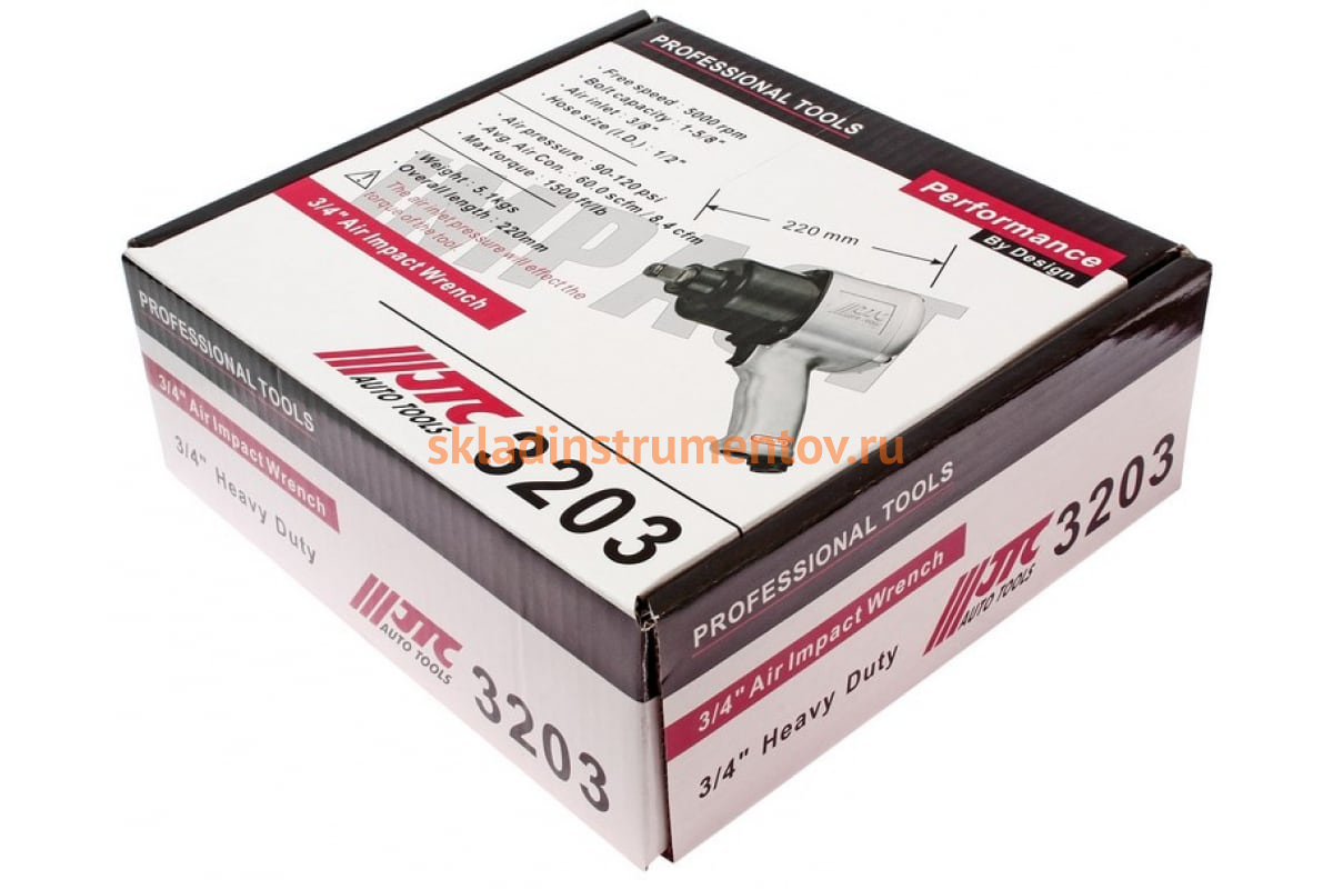 Ударный усиленный пневмогайковерт JTC 3203 работает с крутящим моментом 2034 Нм, что позволяет использовать его для монтажа высоконагруженных соединений. Прочный и долговечный корпус инструмента изготавливается из металла и эффективно защищает внутренние узлы от любого случайного повреждения механического типа. Сфера применения модели - профилактика и ремонт автомобилей.