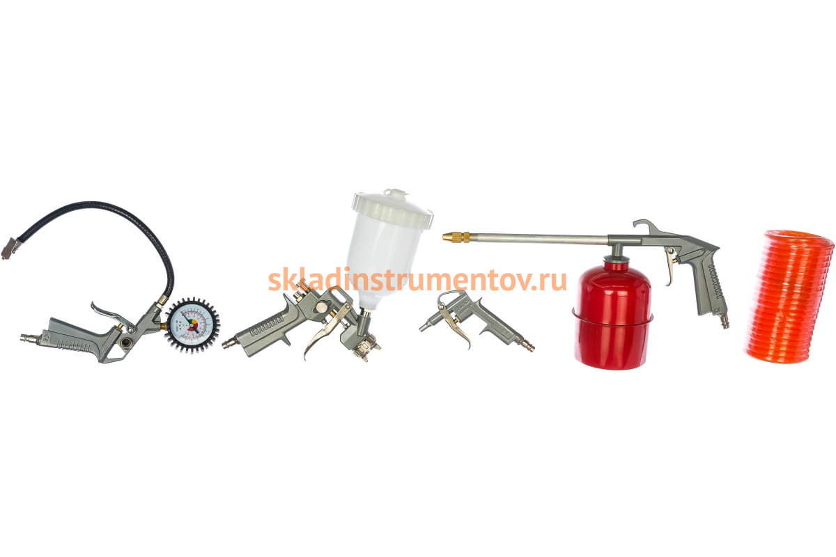 Набор SANTOOL 5 предметов, с быстросъемным соединением 110401-005 используется в гаражах, домашних мастерских, автосервисах, на мебельном производстве, при мелких посадочных работах.