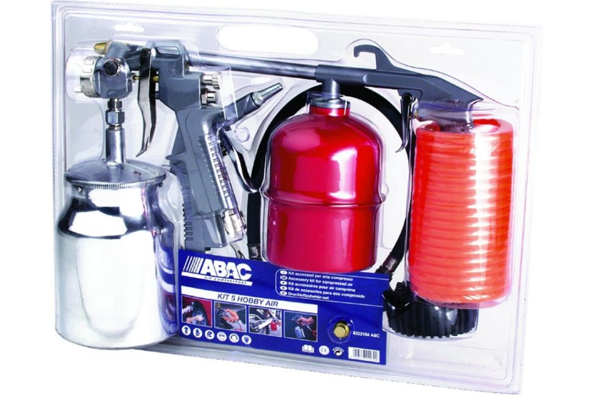 Набор пневмоинструмента из 5 предметов Abac 2809913657 (old 8973005189_8222104) рапид предназначен для проведения различных работ, таких как нанесение лакокрасочных материалов, очистка сильно загрязненных деталей сухой и влажной продувкой. Инструменты имеют комбинированное соединение (есть переходник на разъем байонет и рапид).