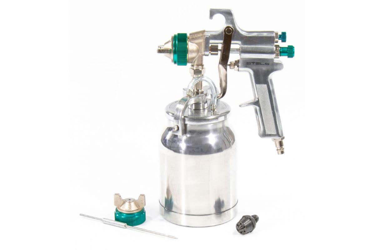 Краскораспылитель STELS AS 702 НP 57364 используется для нанесения на поверхность декоративных покрытий. Его конструкция подразумевает нижнее расположение бачка, вмещающего в себя до 1 литра краски. Корпус инструмента выполнен из качественного металла и имеет полированное хромовое покрытие, что увеличивает срок его службы. Диаметр сопла составляет 1.8 и 2.0 мм.