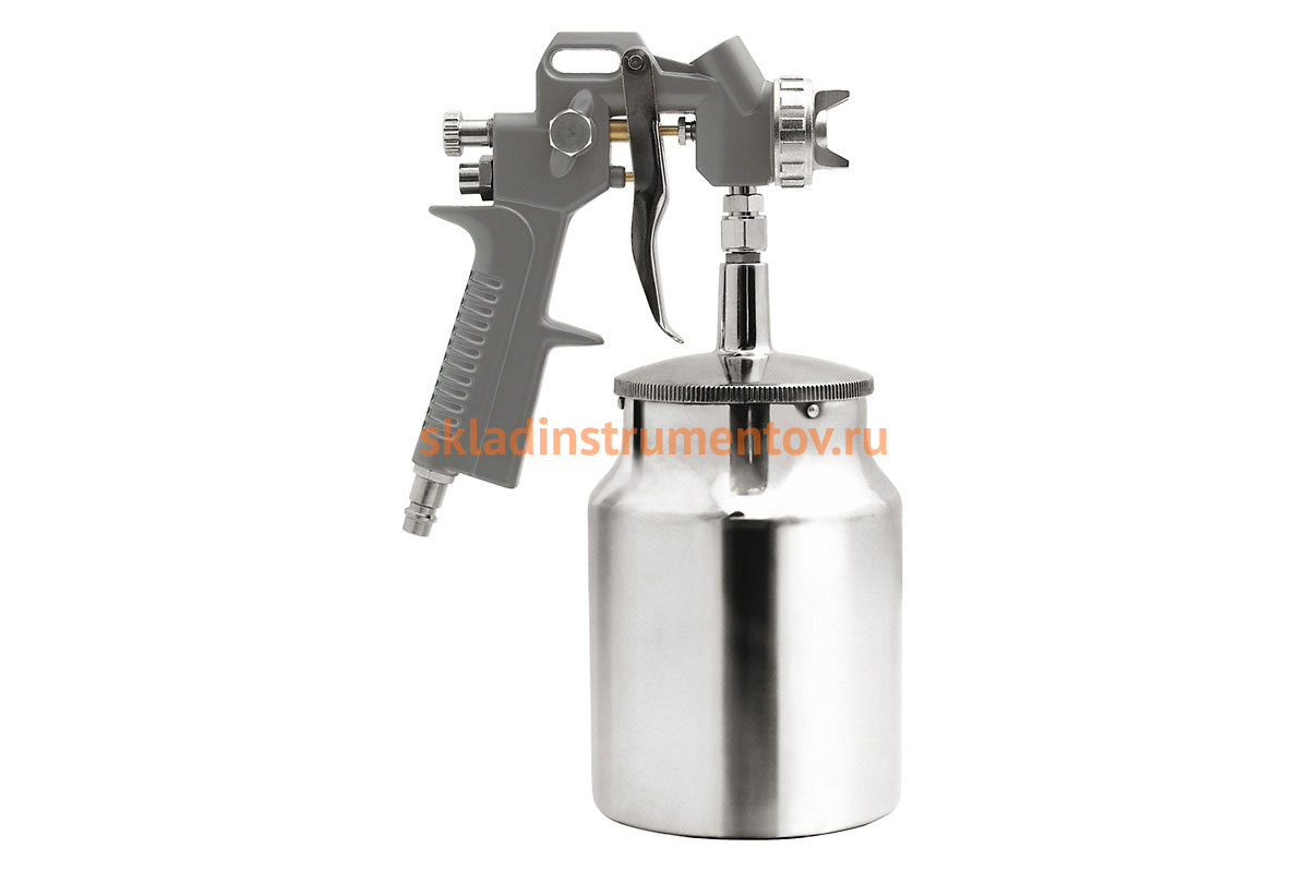 Бачок инструмента выполнен из металла и располагается снизу, не мешая пользователю во время работы. Он способен вместить в себя 1 литр краски.