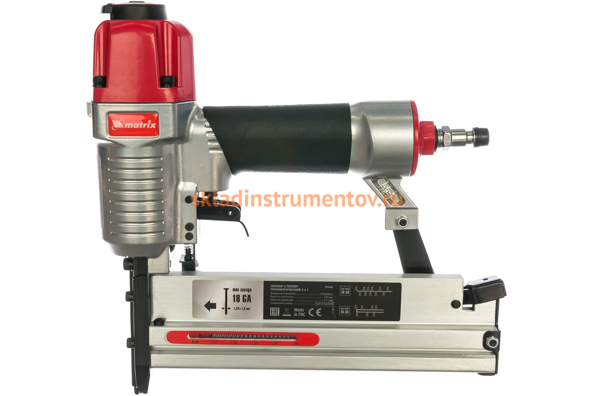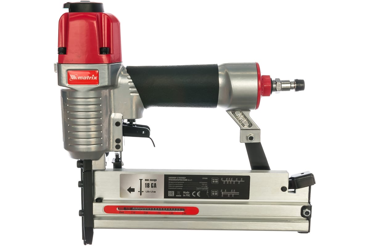 Пневматический нейлер-степлер с регулировкой глубины MATRIX 2 в 1 57428 используется для крепления материалов.
