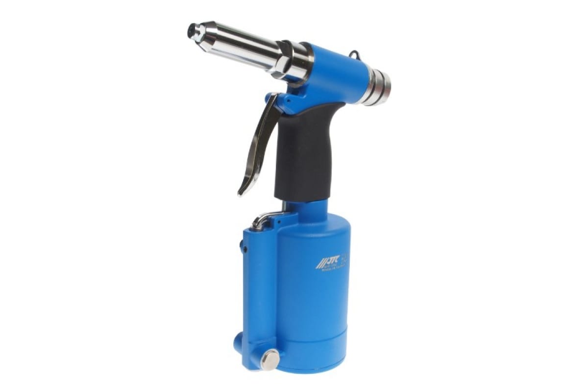 Пневматический заклепочник JTC 7727 применяется для надежного скрепления различных конструкций. В качестве оснастки используются вытяжные алюминиевые заклепки диаметром 4, 4.8, 6, 6.4 мм, стальные (в том числе из нержавеющей стали) заклепки размером 4 и 4.8 мм. Шток - 18 мм.