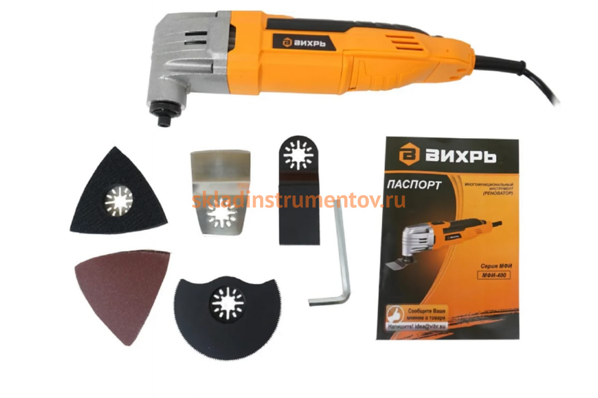 Многофункциональный инструмент-реноватор Вихрь МФИ-400 в кейсе 72/4/3 предназначен для выполнения различных работ: для распиливания и разрезания древесных материалов, пластмассы, гипса, цветных металлов, плитки, для сухого шлифования и полирования небольших поверхностей, для удаления остатков клея, штукатурки, бетона, лакокрасочного покрытия.