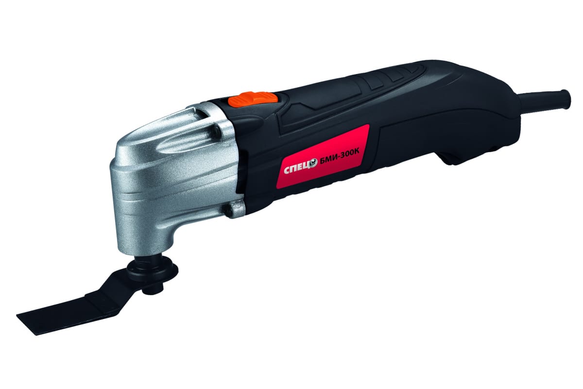 Мультифункциональный инструмент СПЕЦ БМИ-300К используется для резки деревянных, пластиковых, гипсовых и металлических (например, скрепок или незакаленных гвоздей) деталей, а так же для шабрения и сухой шлифовки локальных поверхностей. Инструмент подключается к обычной электросети напряжением 220 В и не требует покупки таких расходных материалов, как аккумуляторы. Модель стабильно работает в широком температурном интервале - от -15 до +40 градусов (влажность не более 80% при +25 градусах). Номинальная мощность агрегата составляет 300 Вт.