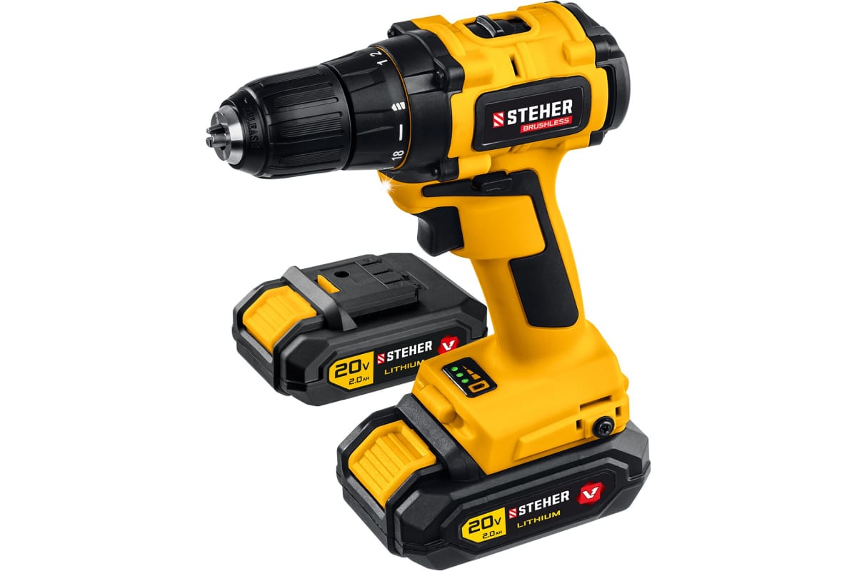 Бесщеточная дрель-шуруповерт STEHER CDB-200-2 используется для сверления отверстий в различных материалах (при установке сверла), а также для вкручивания и выкручивания шурупов, саморезов и винтов (при установке соответствующих бит).