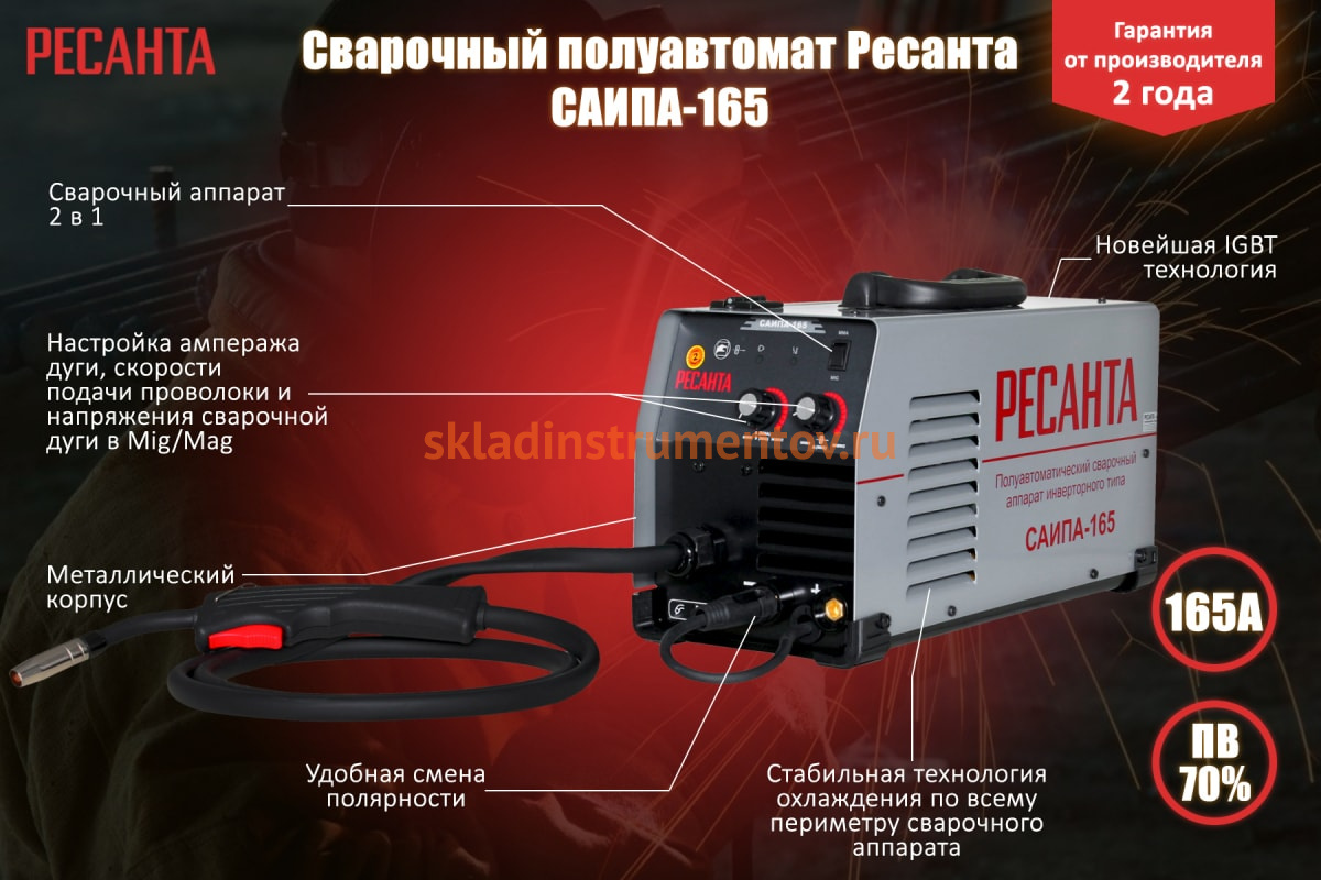Ресанта САИПА 165 предназначен для сварки специальной проволокой. При нажатии клавиши на ручке проволока подается автоматически, что делает сварной шов равномерным. Регулировка скорости подачи проволоки обуславливает толщину свариваемого шва. Диапазон тока 30-160 А предусматривает использование проволоки толщиной от 0.6 до 0.9 мм. Система охлаждения способствует поддержанию рабочей температуры. Аппарат автоматически отключается в случае перегрева. Электронное оборудование на основе IGBT технологий.