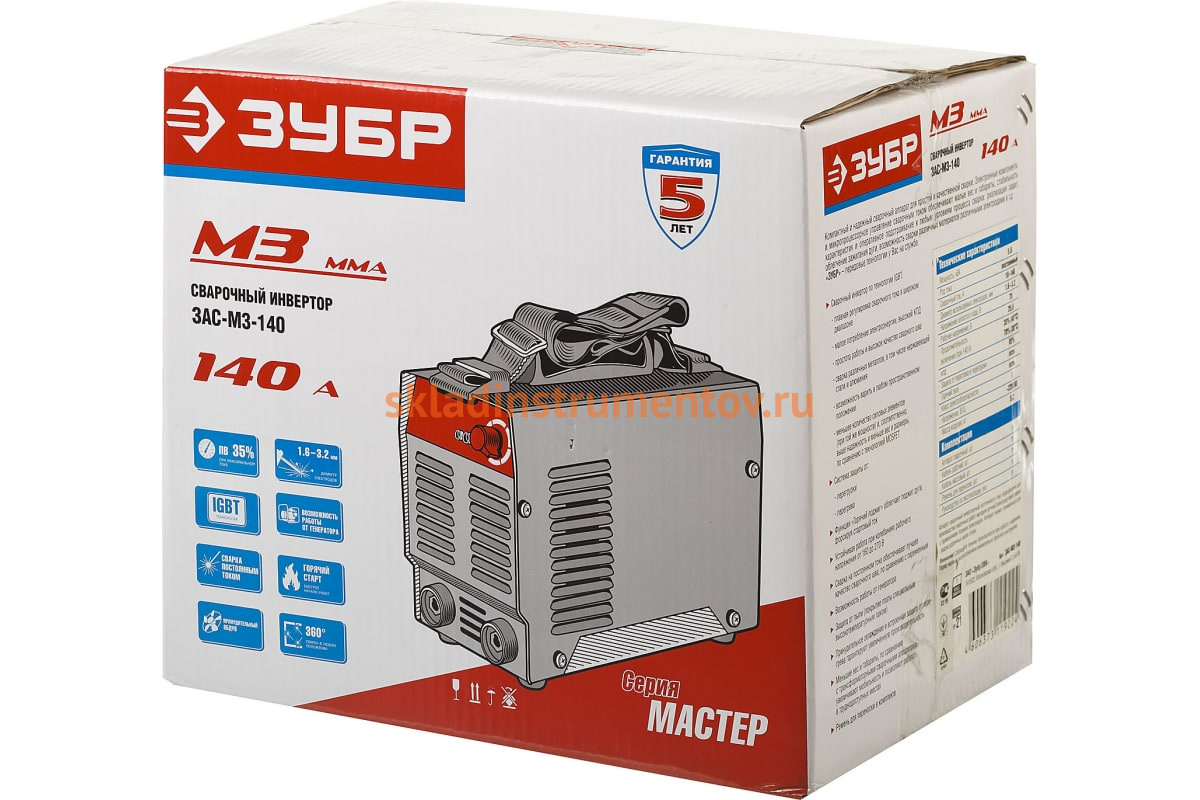 Инвертор ЗУБР ЗАС-М3-140 - однофазный прибор, который используется при работе со штучными электродами. Принудительное охлаждение, установленное в аппарате, предотвращает перегрев и продлевает время непрерывной работы. Плата защищена от пыли специальным высокотемпературным лаком. Высокое качество сварного соединения достигается за счет функции Hot start.